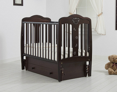 Гладкое лаковое покрытие поверхностей кроватки защитит кожу малыша от получения травм. Для покрытия используется лак на водорастворимой основе – он абсолютно безопасен для младенца.