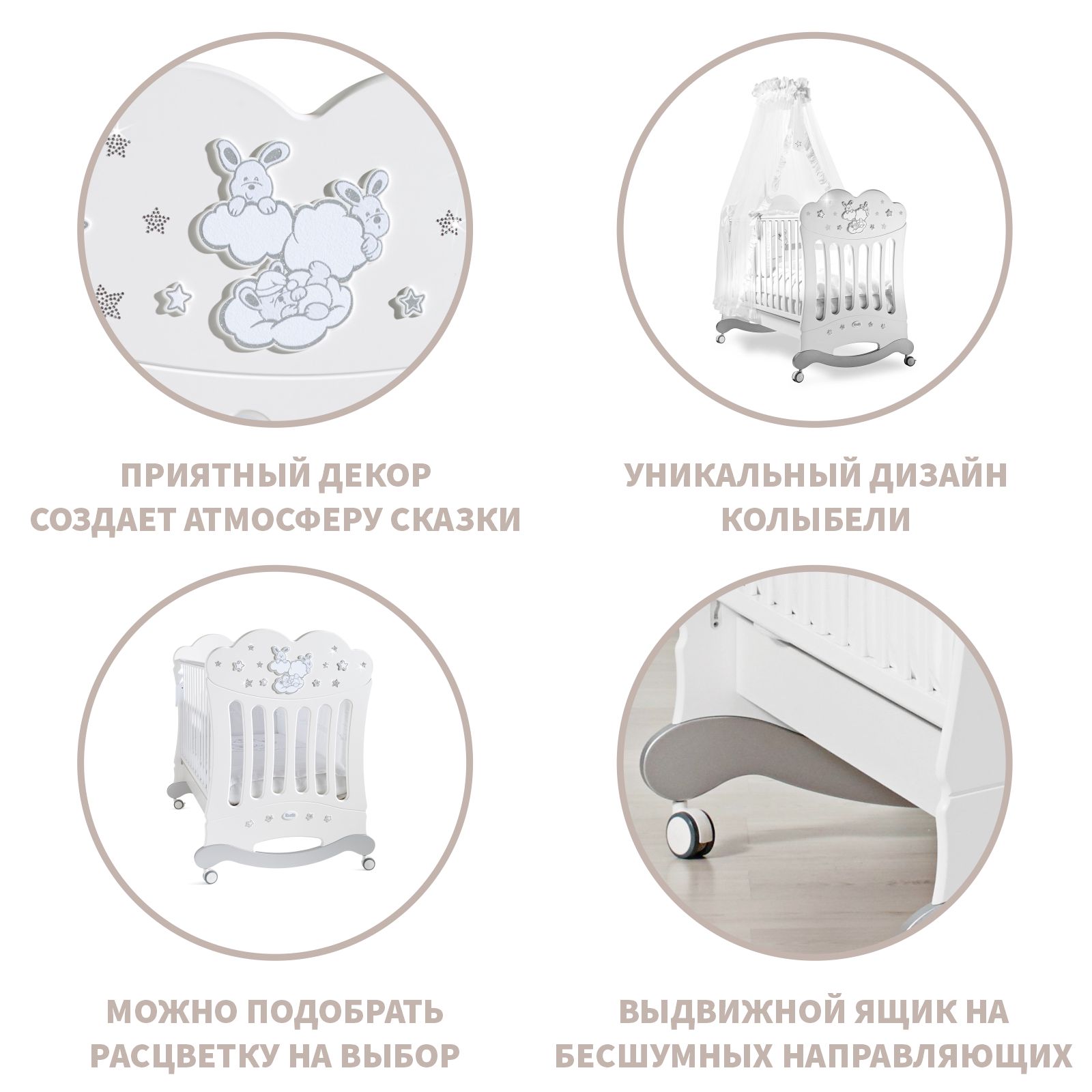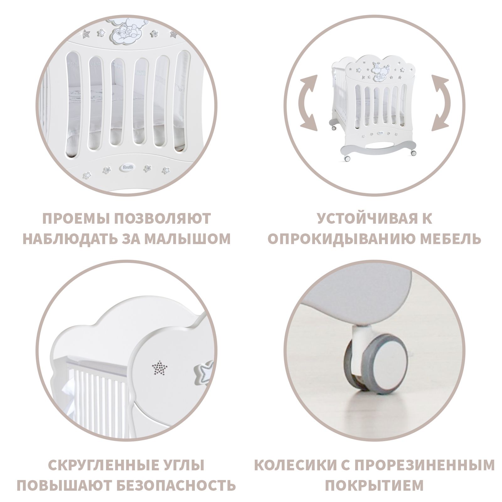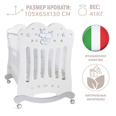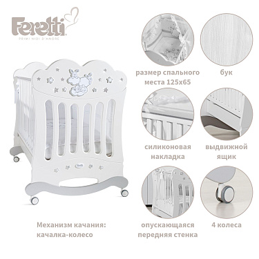 Когда малыш засыпает в кровати-качалке Feretti Etoile, он погружается в ванильные облачка нежности, по которым едва слышно прыгают озорные зайчата, мягкими лапками поглаживая розовые щечки крохи, кончиками ушек касаясь едва двигающихся ресниц, не давая глазкам проснуться раньше времени! В кроватке-качалке Feretti Etoile так легко ощутить тепло объятий мамы. Как же здесь безопасно и уютно, а безупречное качество сборки позволяют мамам быть уверенными в том, что малыш счастлив с первых мгновений в этом мире не во сне, а наяву.