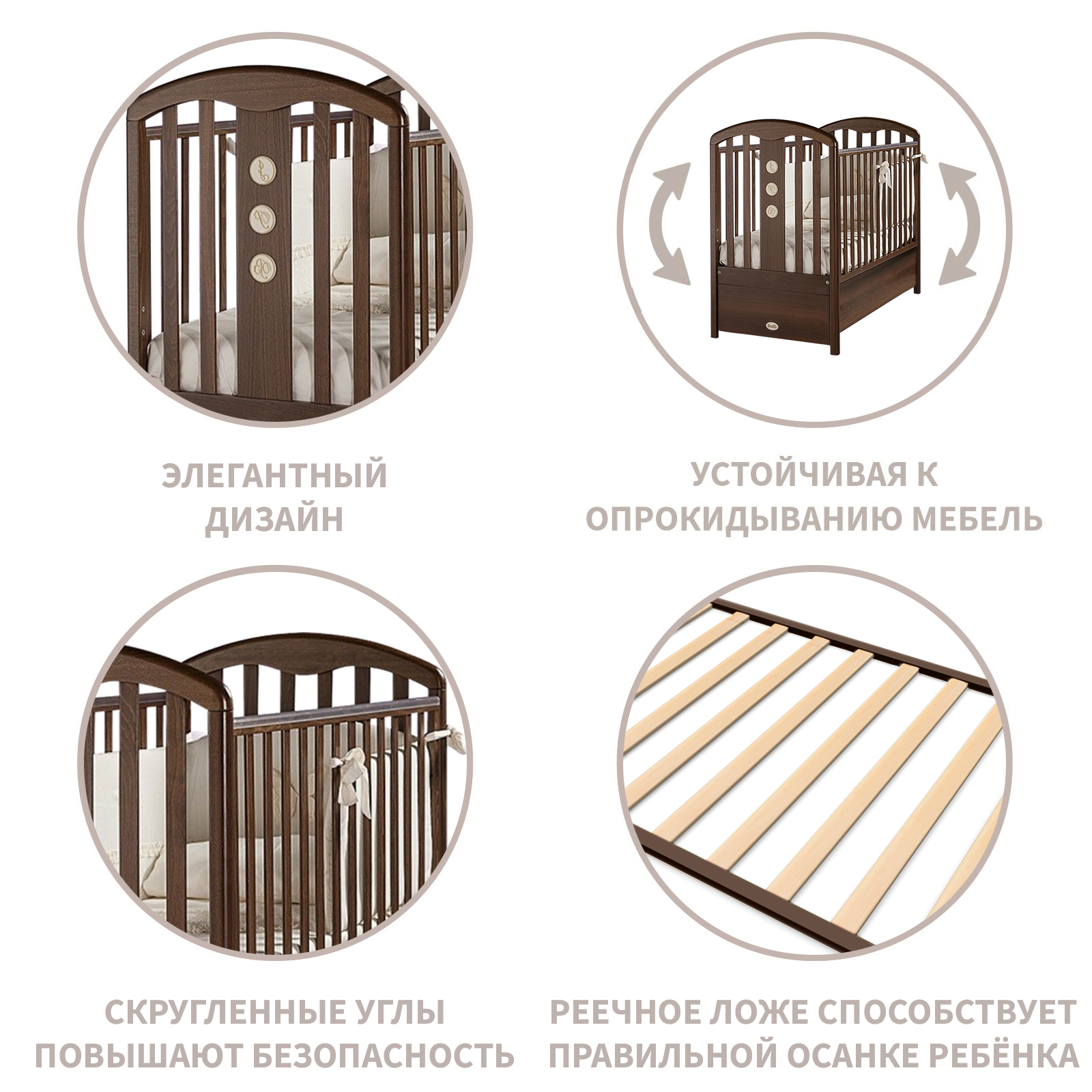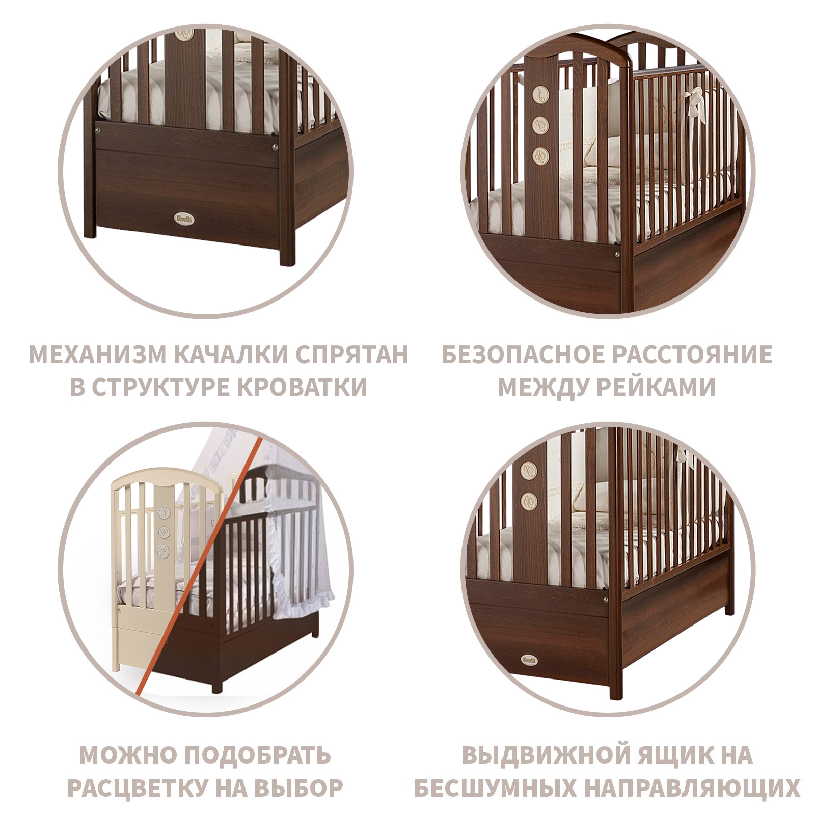 материалы изготовления: бук/мдф/шпонированный бук, покрытие нетоксичным лаками и красками, безопасными для здоровья ребенка, система продольного качания кровати,