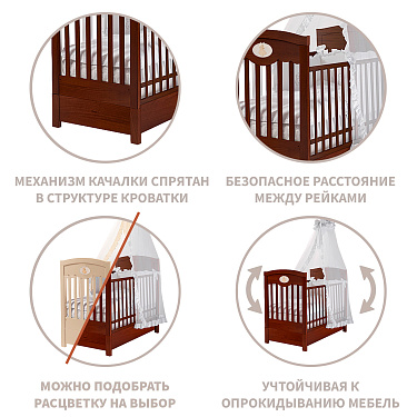 Кровать полностью безопасна для грудничков и деток постарше. В конструкции нет острых углов. Все поверхности идеально гладкие, для которых используются абсолютно нетоксичные и прочные лаки.