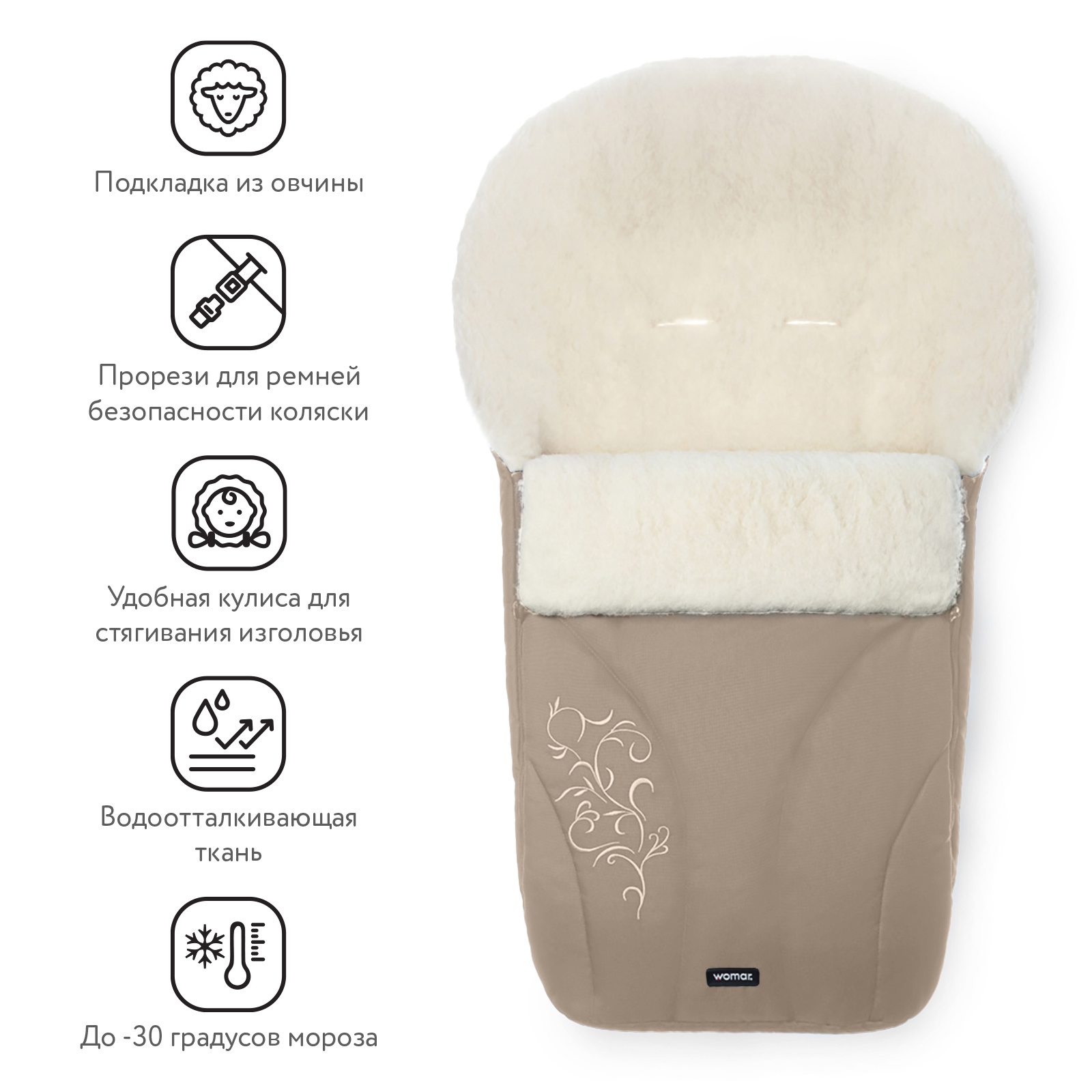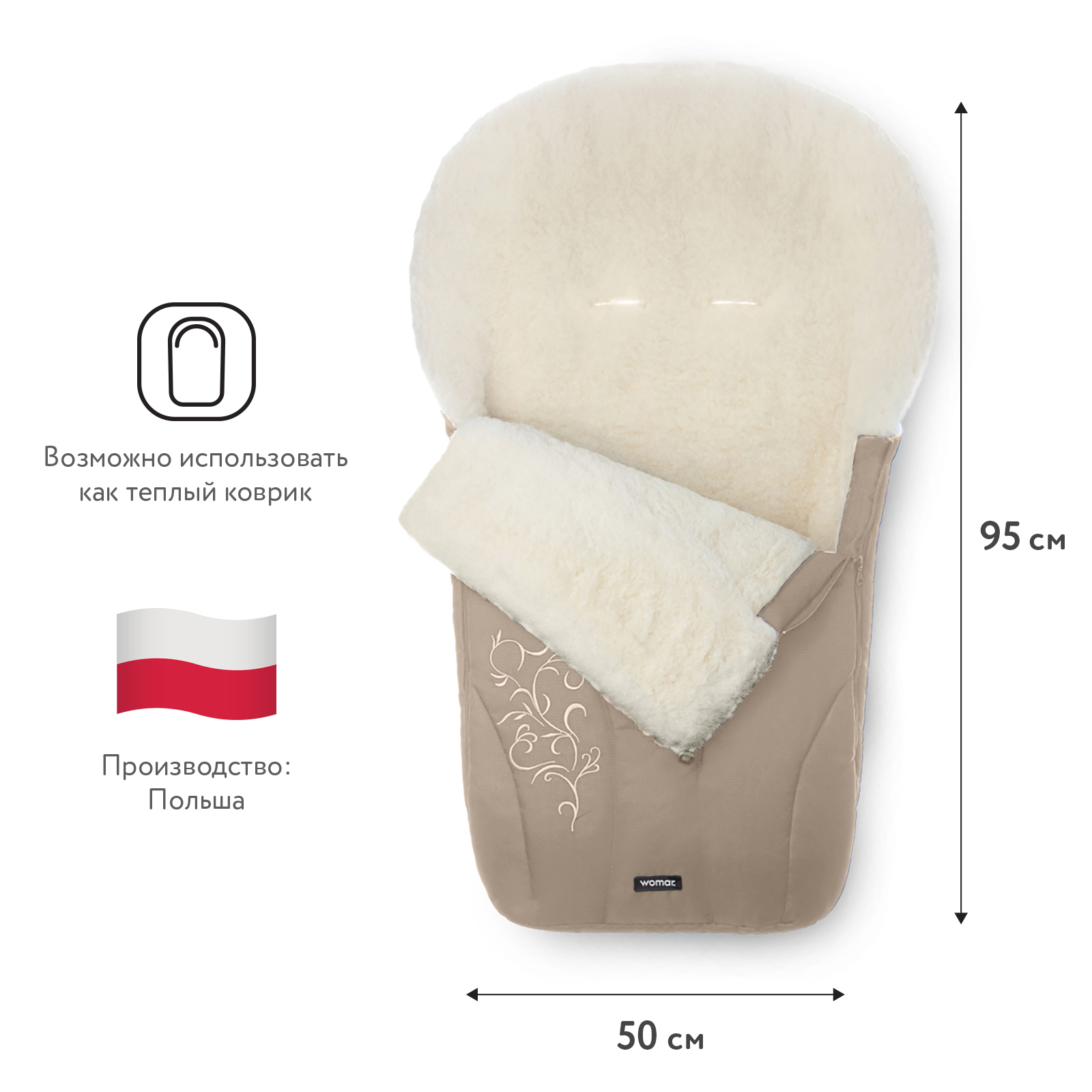 Спальный мешок в коляску Womar Snowflake No 25 - это универсальный детский теплый конверт подходящий практически для любой коляски, представленной на российском рынке. Спальный мешок внутри отделан аналогом овечьей шерсти закрепленной на ткани. Шерсть обладает уникальными природными свойствами, например гипоаллергенностью, антибактериальными свойствами, а так же отлично распределяет тепло по всей поверхности. Кроме того, конверт способен разбираться и превращаться в удобную меховую подстилку.