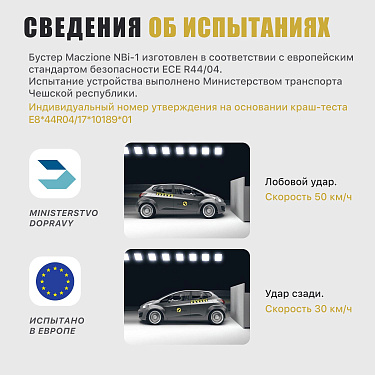 • Конструкция детского бустера Maczione NBi-1 отвечает стандарту безопасности детских удерживающих устройств ECE R44/04, действующему на территории Ев