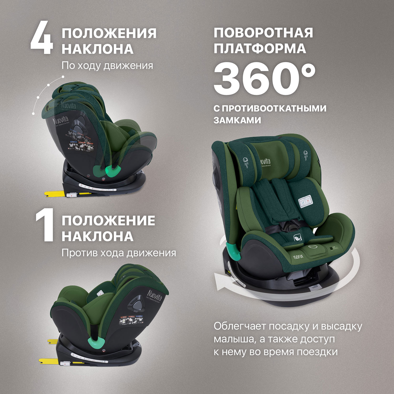 Детское автокресло Nuovita Maczione NiS2-1 предназначено для детей с рождения до 12 лет (рост 40-135 см, группа 0+/1/2/3). Это усовершенствованное детское удерживающее устройство, которое обеспечит ребенку максимальную защиту, поскольку изготовлено в соответствии с европейским стандартом I-Size. Эффективный поворотный механизм, широкие возможности регулировки подголовника и наклона сиденья — залог того, что поездка будет сопровождаться высоким уровнем комфорта. Подходит для автомобилей с ISOFIX.