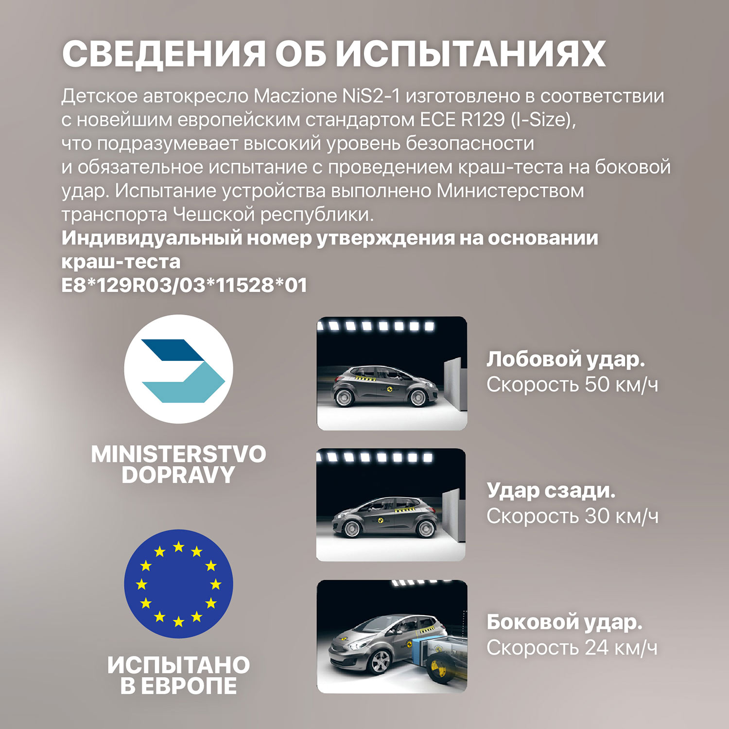• Детское автокресло Maczione NiS2-1 соответствует стандарту ECE R129 (I-Size) и прошло обязательную проверку на устойчивость к боковому удару — индивидуальный номер испытаний E8*129R03/03*11528*01.