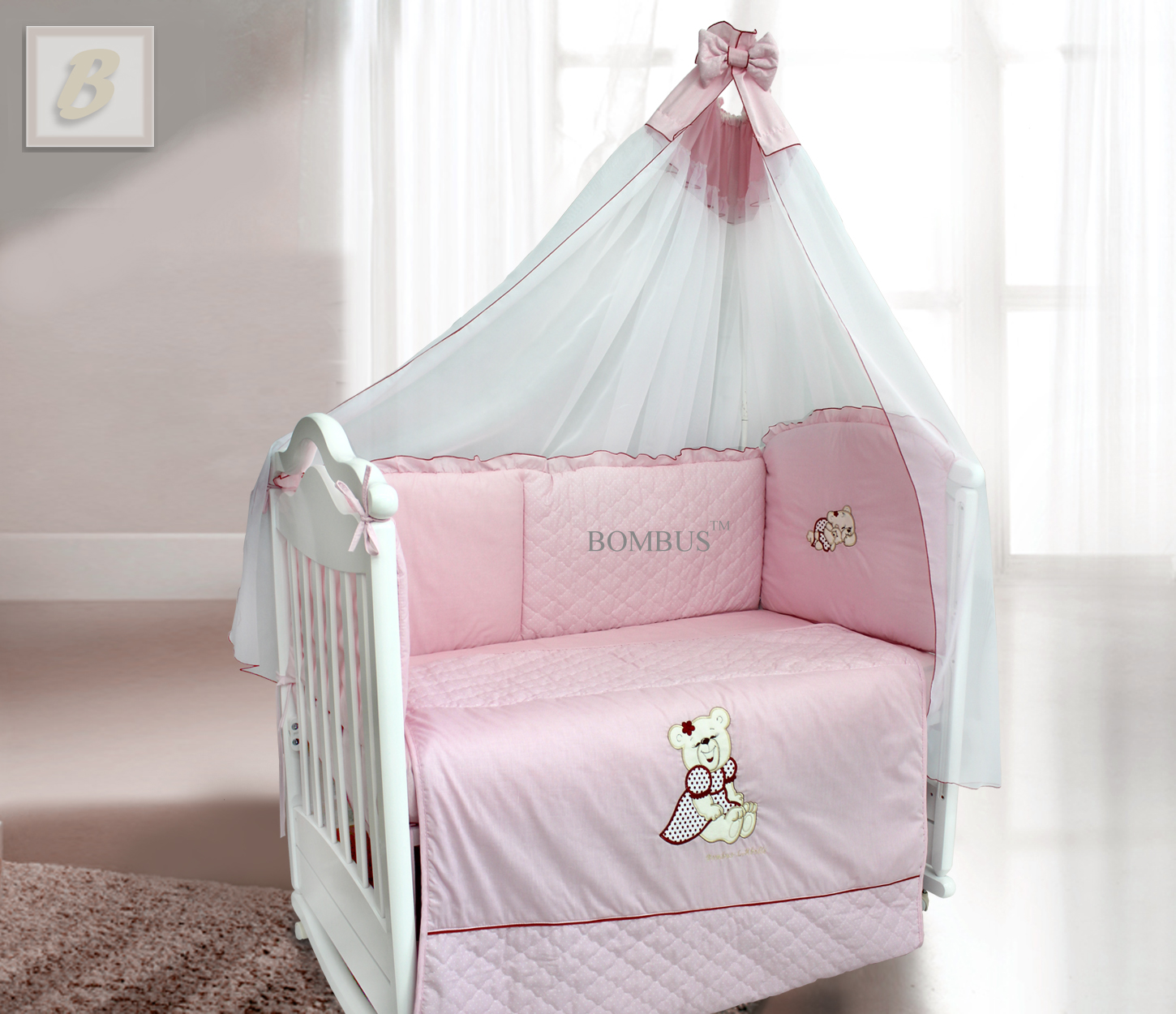 Комплект в кроватку Bombus "Мишка фаворитка" 1796 6 предметов очень нежный и симпатичный комплект, который украсит кроватку вашей малышки. Бортик в изголовье и одеяло украшены эксклюзивной 3D вышивкой. Отделка кантом подчеркивает красоту вышивки и является отличным дизайнерским решением. Стежка комплекта выполнена на высокотехнологичном импортном оборудовании, что позволяет воплотить дизайнерские и технологичные идеи в создании этого комплекта. Комплект выполнен из высококачественной хлопковой ткани. В качестве наполнителя используется Холлкон, он хорошо пропускает влагу, гипоаллергенный, дышащий и создает комфортный микро – климат в кроватке. Бортики по всему периметру кроватки сделают сон малыша безопасным. Нежный балдахин изготовлен из мягкой и нежной вуали. Это элегантный и красивый аксессуар для детской кроватки. Создает ощущение уюта и красоты.