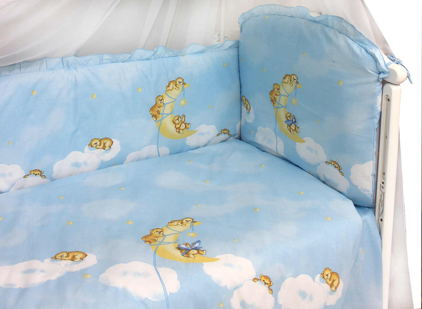 Комплект в кроватку Bombus «Лунный Мишка» 7 предметов изготовлен из 100% хлопка(миткаль). Миткаль отличается тонкостью нити, за счет чего ткань получается легче и тоньше. В качестве наполнителя используется Холлкон, он хорошо пропускает влагу, гипоаллергенный, дышащий и создает комфортный микро – климат в кроватке. Нежный балдахин, изготовленный из мягкой вуали и отделанный вставкой из ткани, создаст уют.
