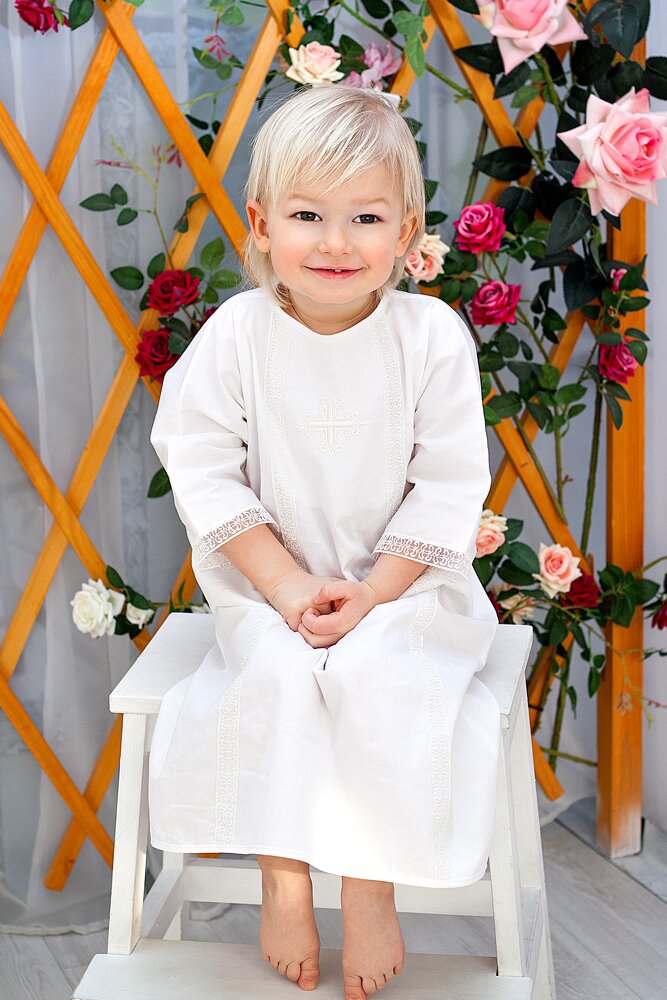 Крестильная рубашка для мальчика Антон, длина - в пол. Выполнена из натуральной хлопковой ткани молочного цвета, декорирована кружевом в тон рубашки, на груди вышивка в виде православного креста молочными нитями, так же в тон рубашки. Крестильная рубашка Антон лаконична, строга, и в то же время, нарядная. Ткань сатин, состав 100% хлопок.
