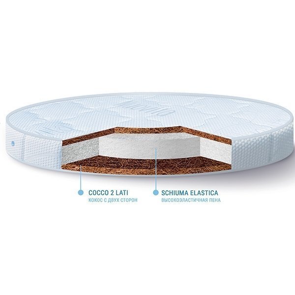 Детский матрас Nuovita Donnola (75х75) - безопасная для детей с рождения и долговечная конструкция выполнена из двух основных экологически чистых материалов, обладающих хорошими ортопедическими и гигиеническими свойствами. Первый наполнитель – латексированное кокосовое волокно. Этот материал обеспечивает необходимую поддержку для тела спящего  (особенно важно для первых лет жизни ребенка) и способствует формированию у него красивой осанки. Второй наполнитель – упругий блок высокоэластичной пены. Оба слоя соединены между собой посредством нанесения горячего клея, который, в отличие от применяемого во многих других матрасах, создан на основе натуральной смолы без токсичных компонентов. Чехол изделия сшит из гигиеничного натурального материала – хлопкового жаккарда итальянского производства, который свободно вентилируется и отводит влагу от тела.