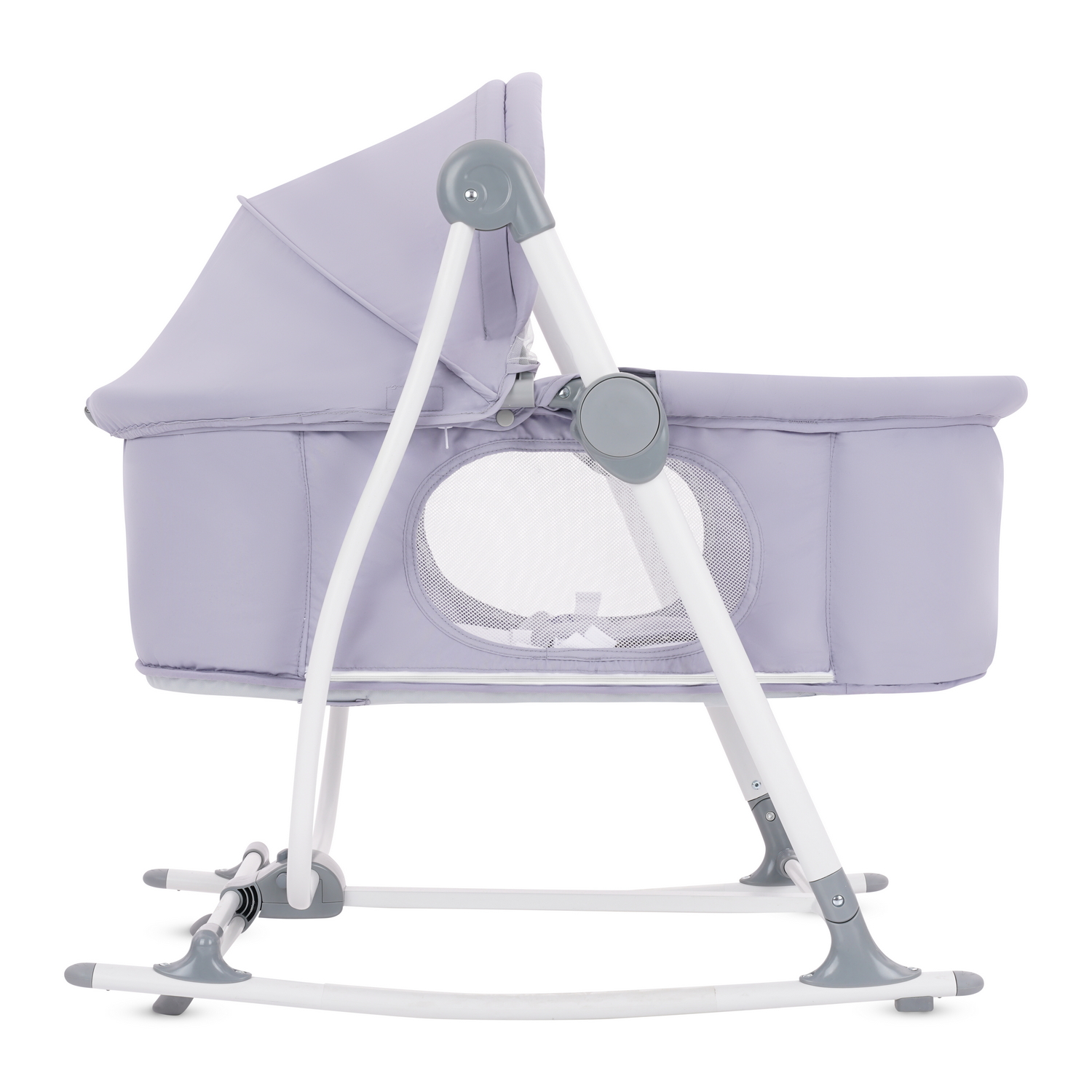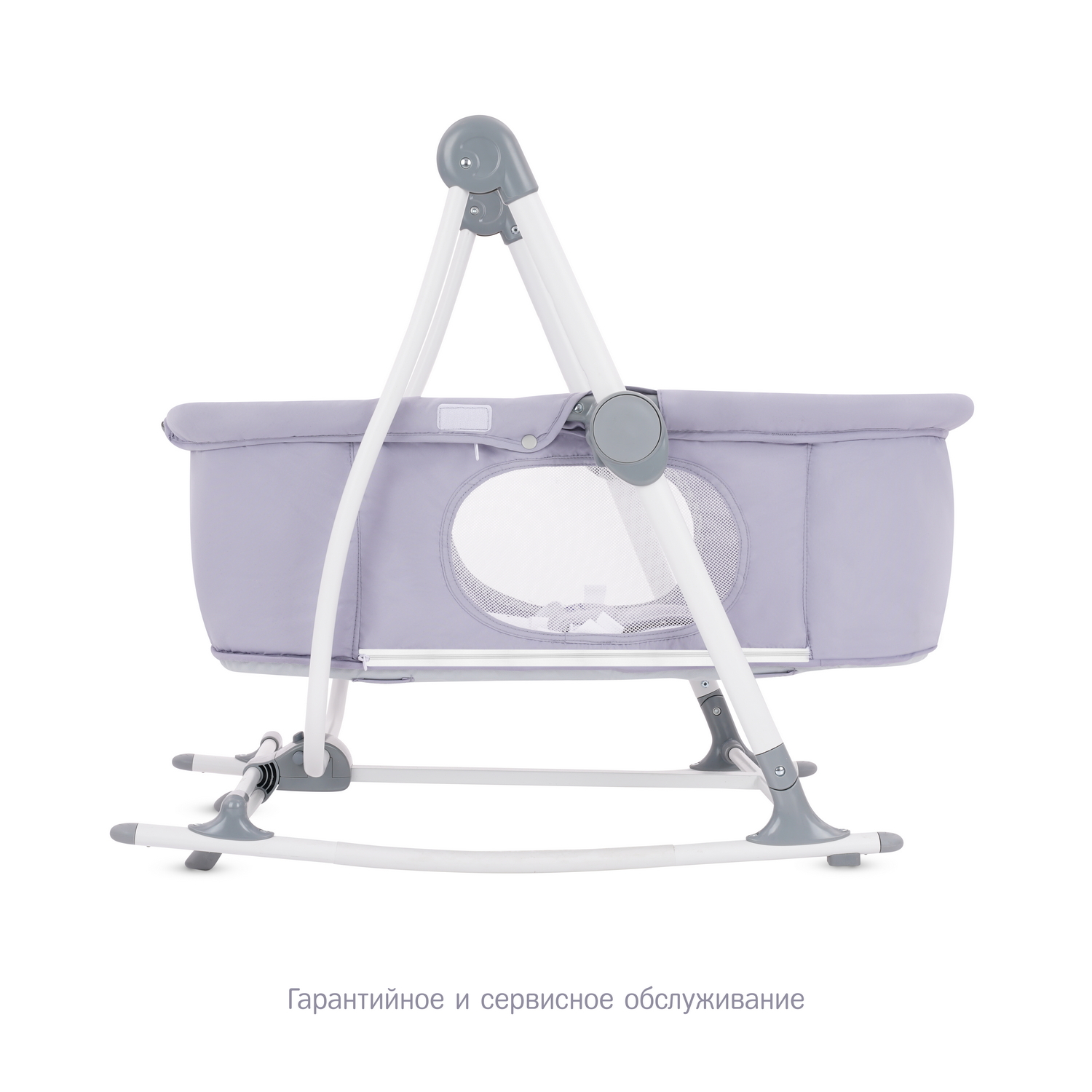 2. Люлька. Качание выполняется вручную, традиционным способом на полозьях. Чтобы зафиксировать колыбель в неподвижном состоянии, достаточно повернуть стопор на полозьях. Для наблюдения за ребенком и вентиляции предусмотрены 2 окошка из прочной полиэфирной сетки. Для защиты от насекомых также имеется и москитная сетка, что позволяет пользоваться колыбелью на