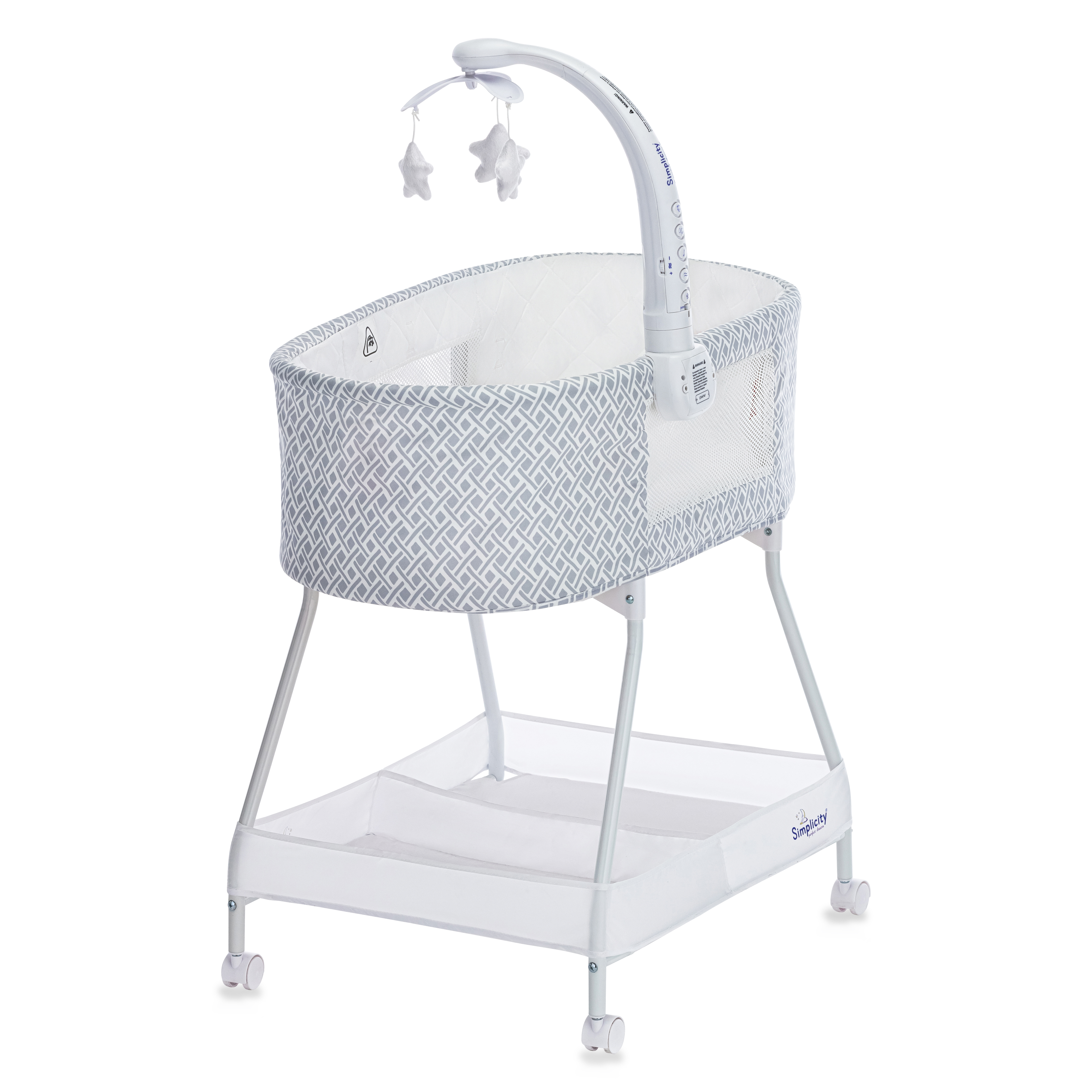 Среди преимуществ Simplicity 25020 Classic выделяется электронный мобиль с подвесными игрушками, совмещенный с блоком управления колыбелью. Мобиль работает от батареек и выполняет одновременно несколько функций: вращает карусель с подвесными мягкими игрушками, осуществляет музыкальное сопровождение с синхронно мерцающими огоньками, которые помогут успокоить или развлечь малыша, включает вибрацию и ночную подсветку. Вибромассаж станет особенно полезным в периоды беспокойства от коликов. Работа устройства регулируется таймером, предусмотрено изменение интенсивности виброукачивания и громкости музыкальных мелодий. Мобиль можно установить как на правом, так и на левом бортике люльки.