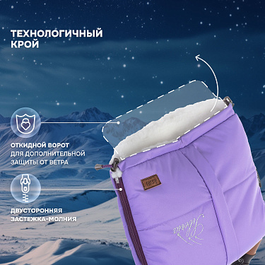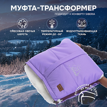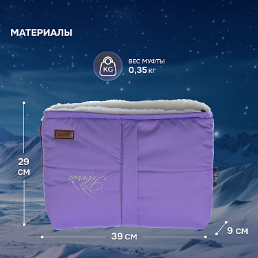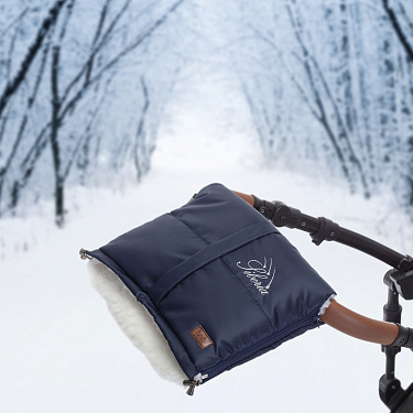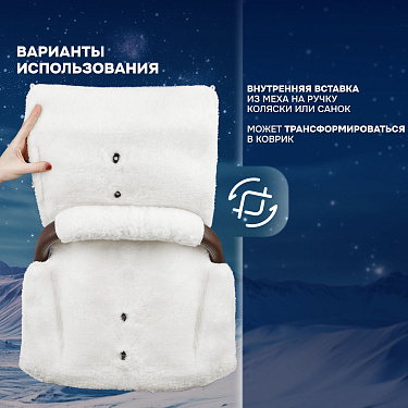 В комплекте имеется внутренний чехол, закрепляемый на ручке коляски или санок, и не позволяющий коже контактировать с холодным пластиком. Меховые отвороты, которые фиксируются при помощи специальных зажимов, регулируют глубину муфты и служат эффектным украшением.
