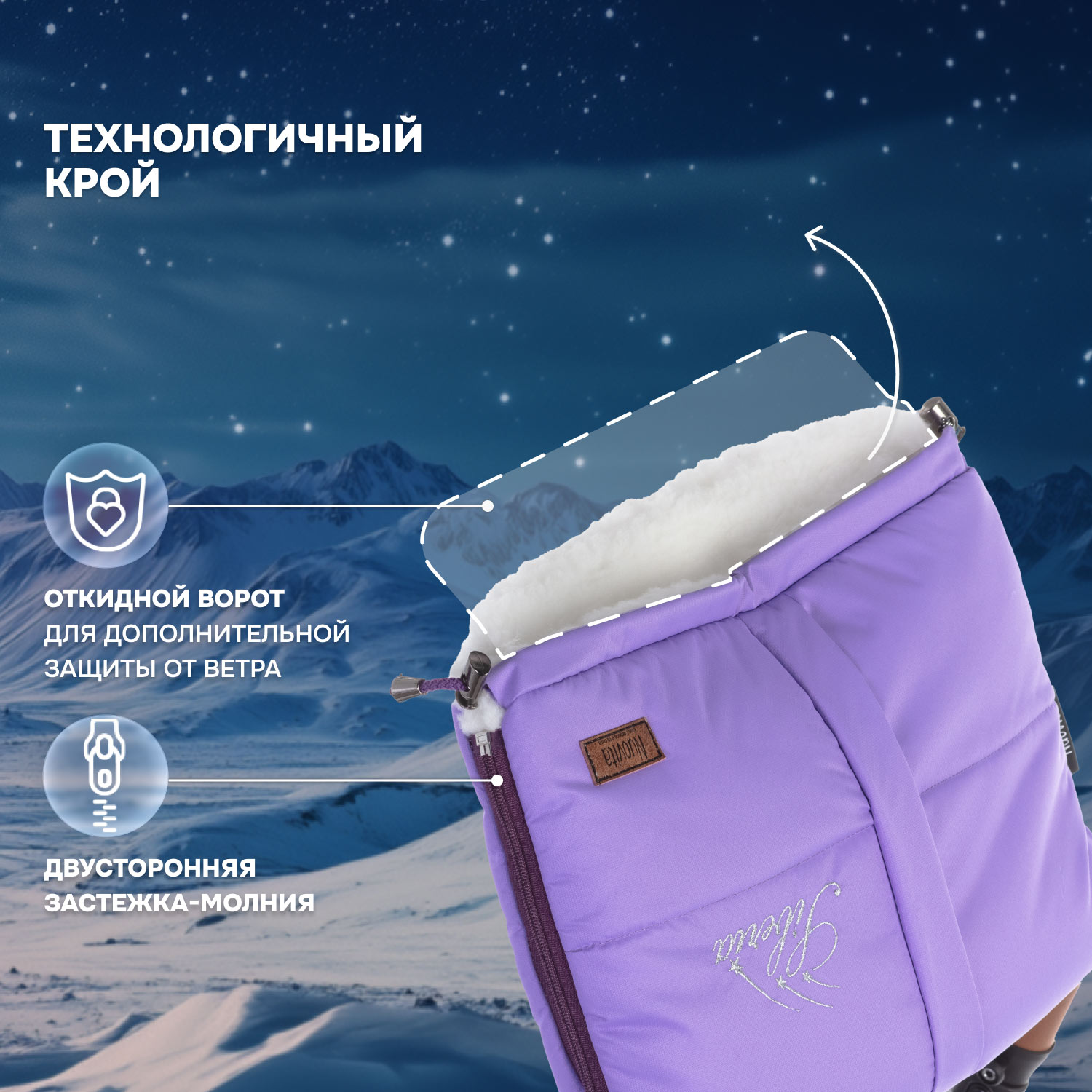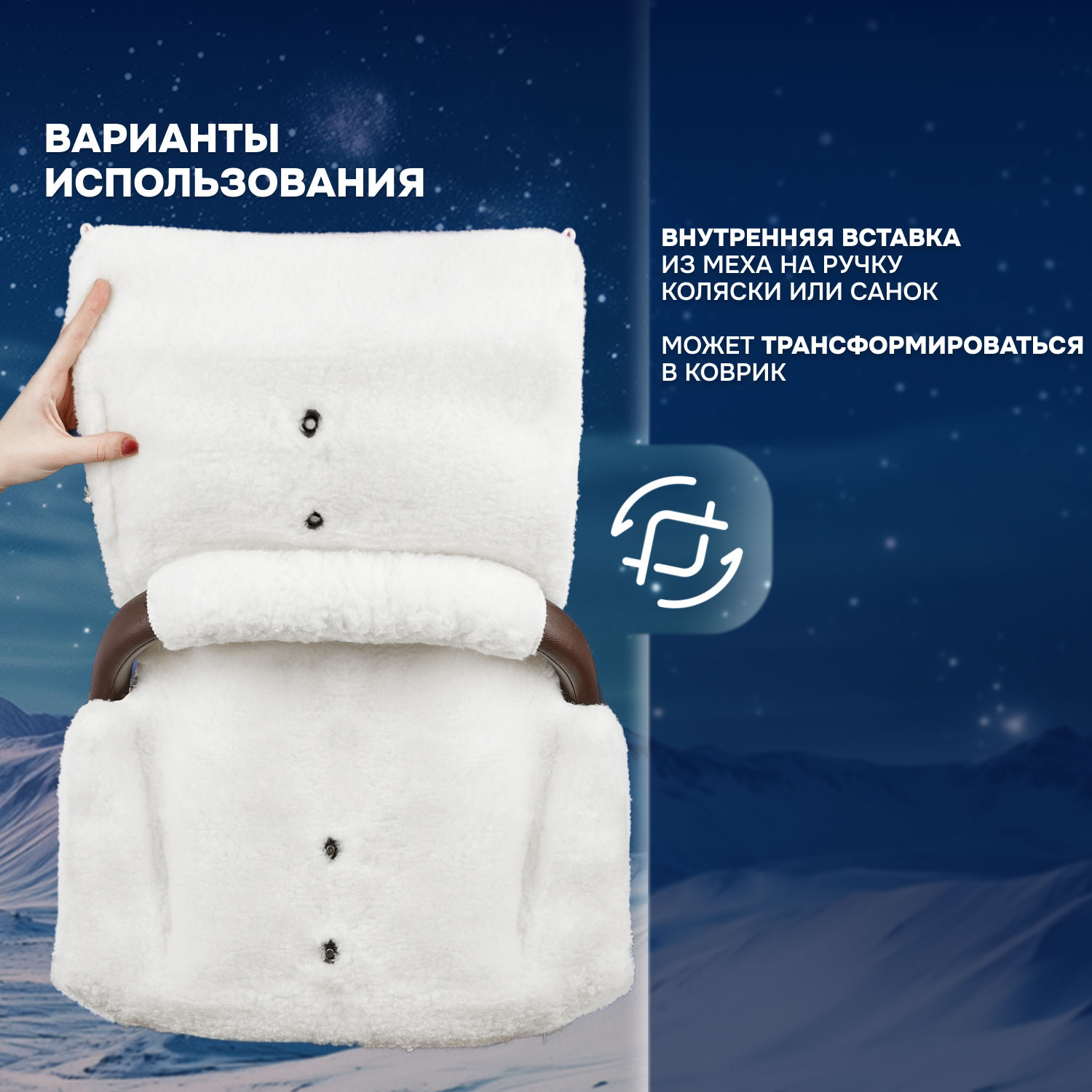 В комплекте имеется внутренний чехол, закрепляемый на ручке коляски или санок, и не позволяющий коже контактировать с холодным пластиком. Меховые отвороты, которые фиксируются при помощи специальных зажимов, регулируют глубину муфты и служат эффектным украшением.