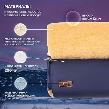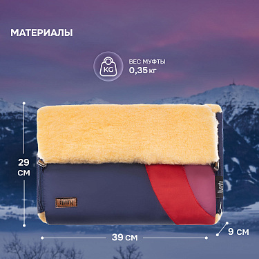 Меховая основа, из которой сделана внутренняя часть муфты, представляет собой смесовую овечью шерсть с высоким мягким ворсом (высота 12 мм). Она отлично сохраняет тепло, поэтому изделием можно пользоваться до температуры -30 градусов. Добавление к меху синтетического волокна препятствует слеживанию шерстяного ворса.