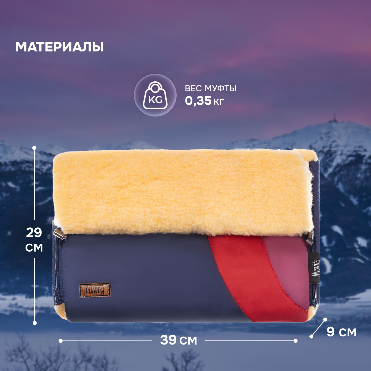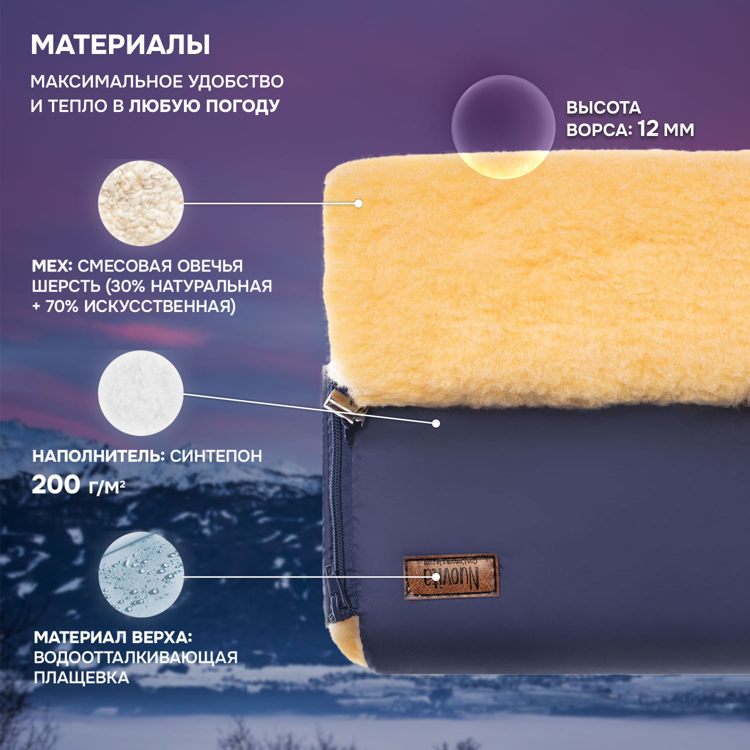 Меховая основа, из которой сделана внутренняя часть муфты, представляет собой смесовую овечью шерсть с высоким мягким ворсом (высота 12 мм). Она отлично сохраняет тепло, поэтому изделием можно пользоваться до температуры -30 градусов. Добавление к меху синтетического волокна препятствует слеживанию шерстяного ворса.
