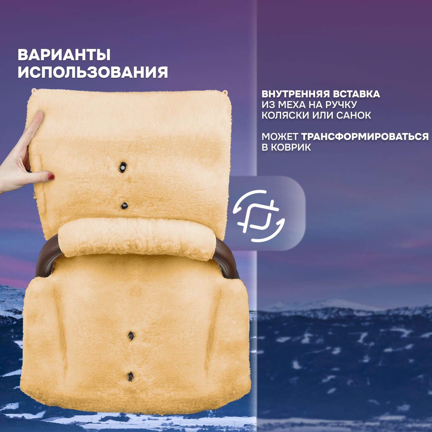 Полностью расстегнув замки и кнопки, можно превратить муфту в коврик, который пригодится для пикников или поездок в машине. Дополнительно в комплект входит узкая муфта-чехол. Она закрепляется на ручке коляски при помощи застежек-«липучек» и оберегает кожу от контакта с холодным пластиком.