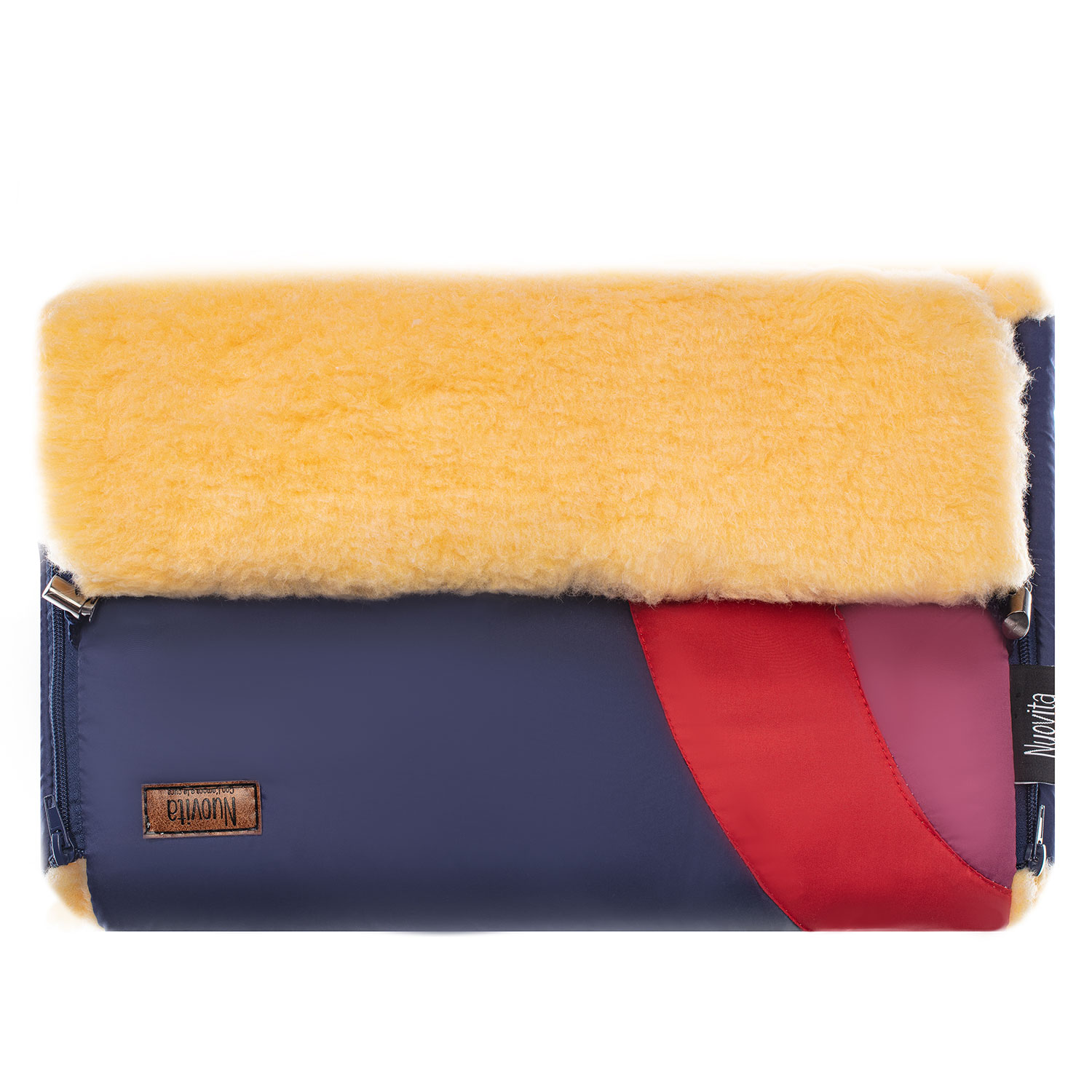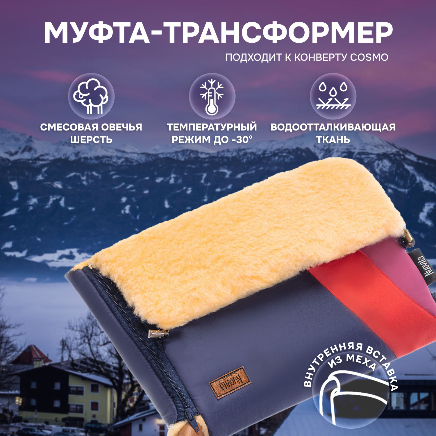 Среди моделей NUOVITA COSMO можно выбрать муфту с белым или персиковым цветом меха и различными расцветками чехла. Это позволяет составить единый комплект с меховым конвертом или подобрать муфту в тон коляски.
