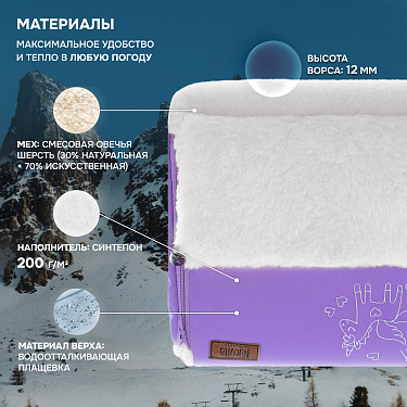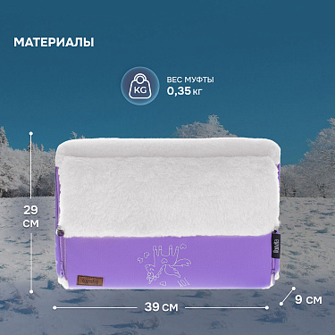 Внутренняя часть муфты изготовлена из пушистого меха, который представляет собой смесовый шерстяной ворс. Высота меха 12 мм, он создает объемную воздушную прослойку, защищая от попадания холода. Шерстяные волокна отлично сохраняют тепло и не допускают перегрева, что позволяет пользоваться муфтой при температуре от 0 до -30 градусов.