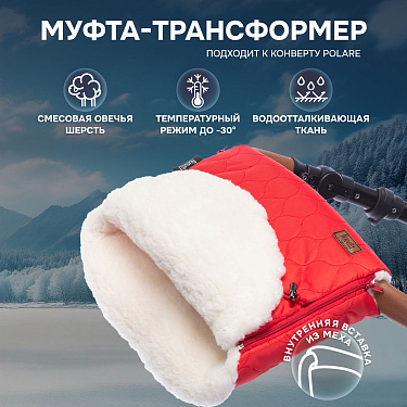Эффектная простежка в виде ромбов придает изделию привлекательный внешний вид. На выбор предлагается 12 расцветок наружного покрытия, сочетающихся с белым или персиковым мехом. Максимально выигрышно муфта NUOVITA POLARE смотрится в комплекте с детским меховым конвертом из одноименной серии.