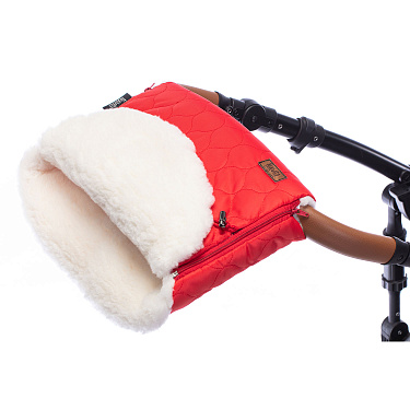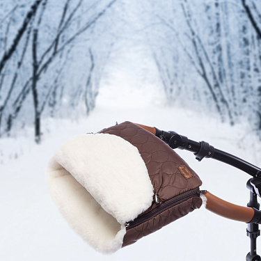 Муфта крепится на ручке коляски при помощи 2-х «молний», вшитых в боковые срезы. По краям предусмотрена окантовка, защищающая замки от попадания ворса. По центру находятся 2 внутренние кнопки-фиксаторы. Глубина отворотов регулируется на усмотрение владельца и закрепляется пластиковыми зажимами. Фурнитура имеет высокое качество и полностью соответствует цвету материала, являясь дополнительным украшением модели.