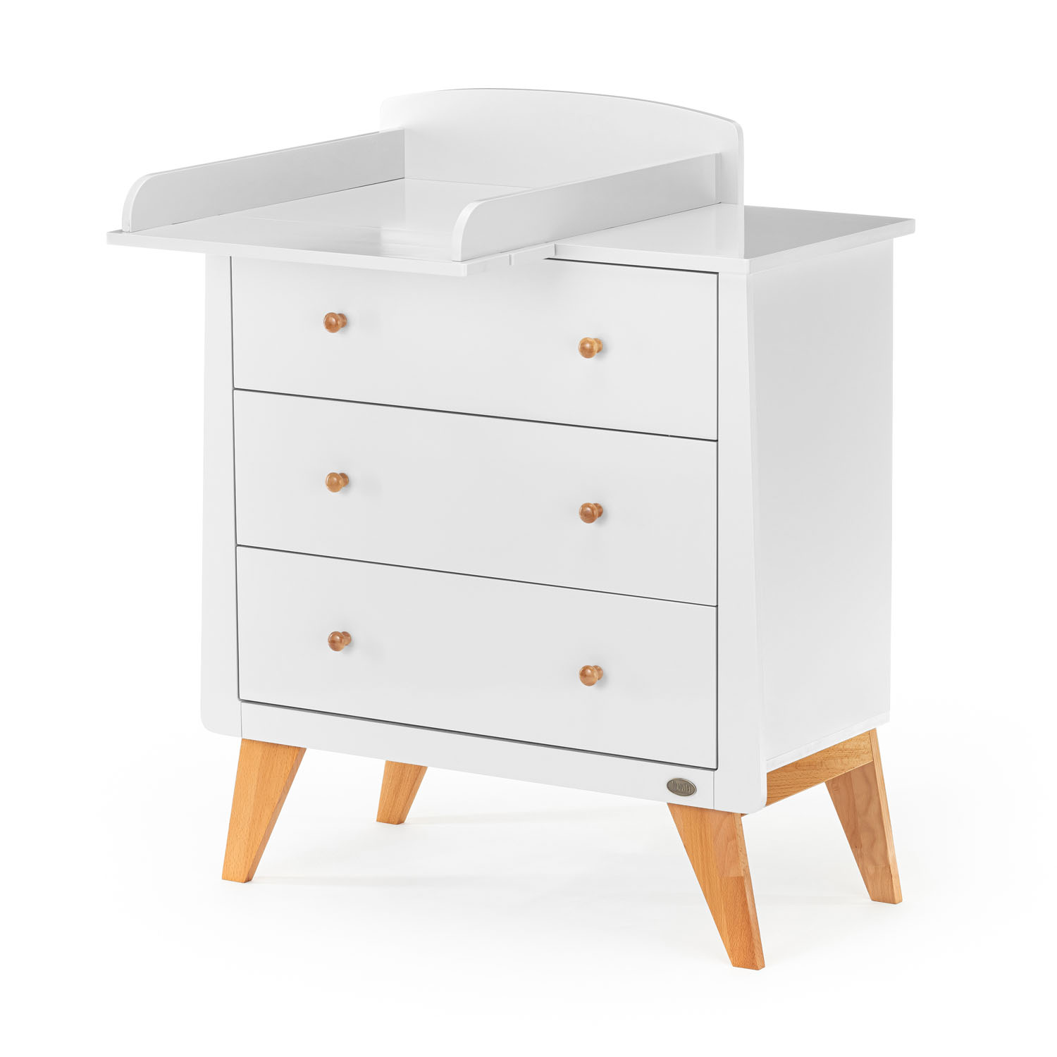 На столешнице будет удобно хранить салфетки и детскую косметику, три просторных ящика позволят разместить подгузники и белье, а плавные доводчики помогут ловко открывать и закрывать ящики даже одной рукой — ведь второй вы будете частенько держать младенца. Преимуществом данной модели также является съемная пеленальная накладка, которую можно установить как в левой, так и в правой части комода.