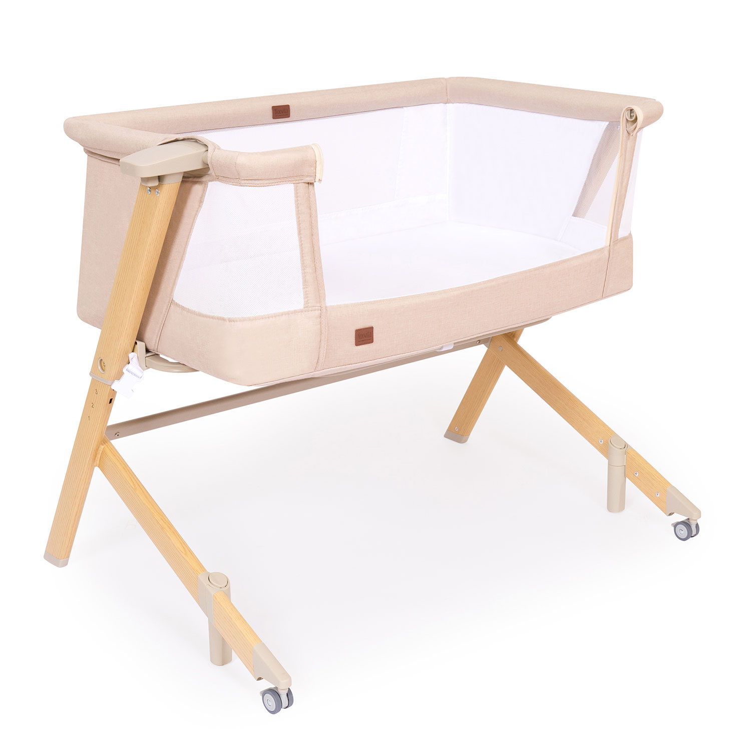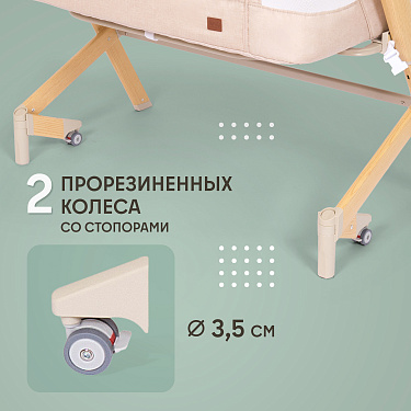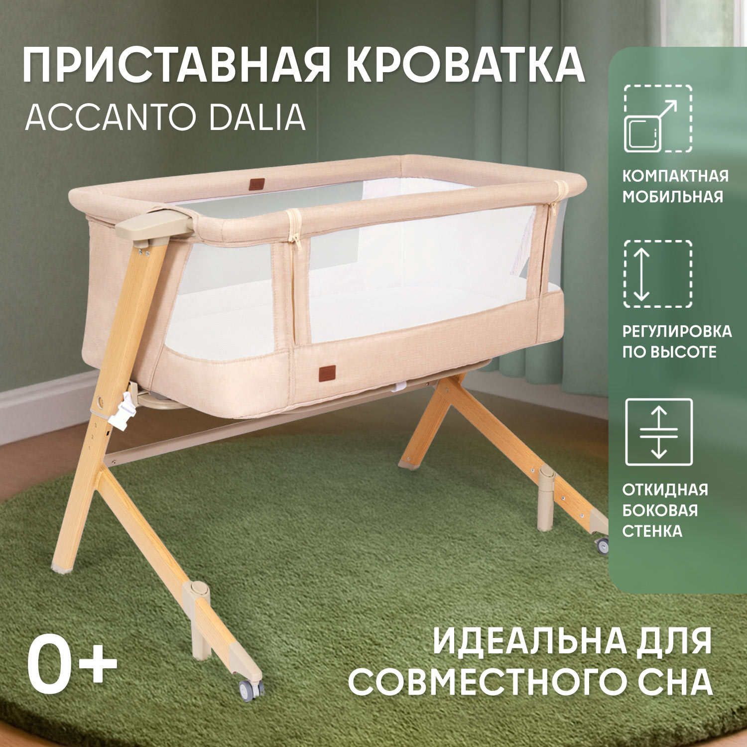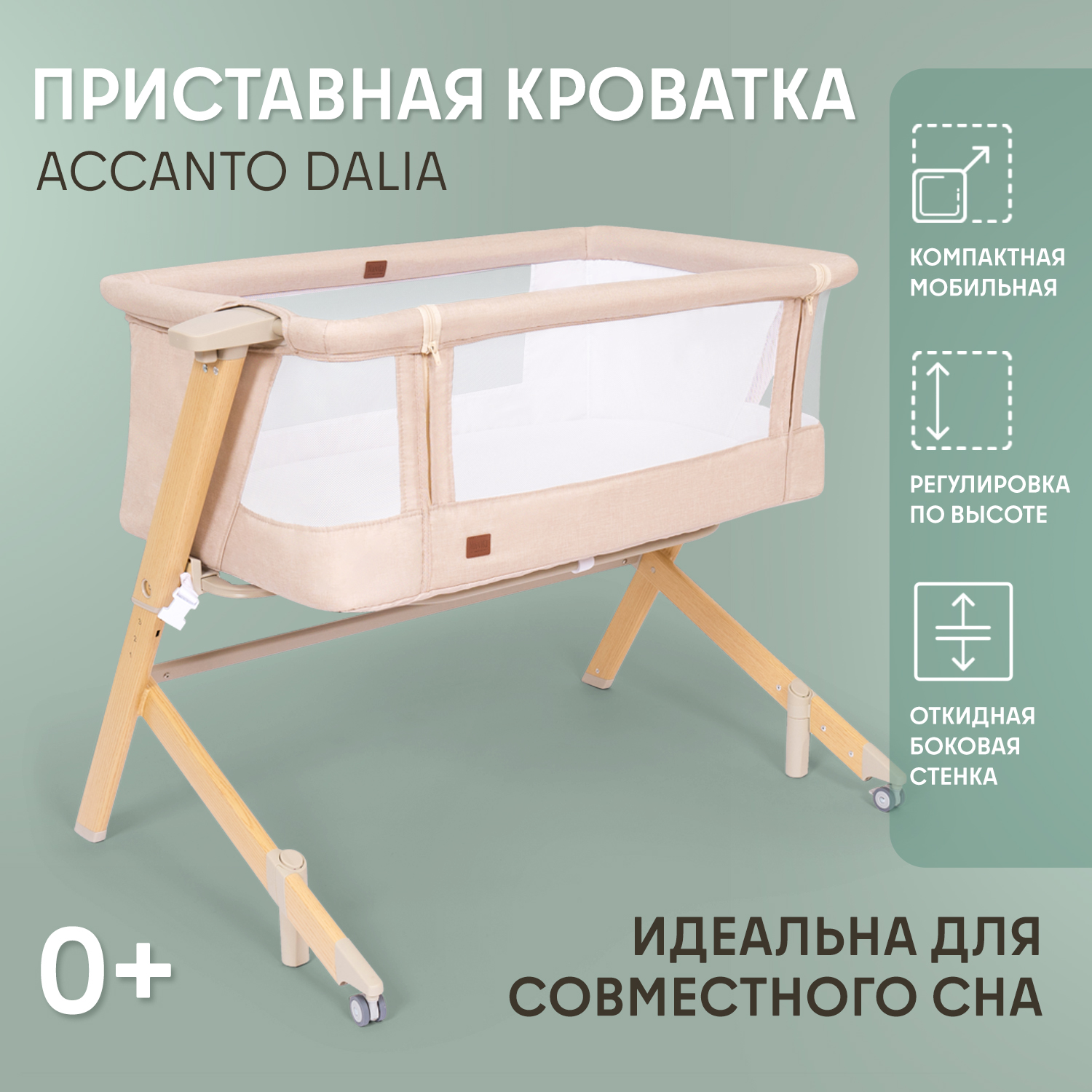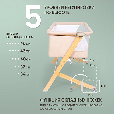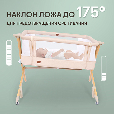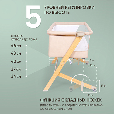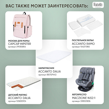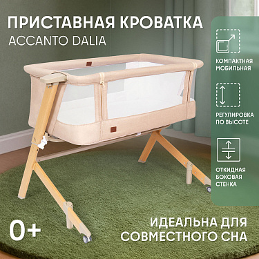 Здоровый сон новорожденного младенца — заветная мечта молодых родителей, исполнить которую поможет приставная колыбель Accanto Dalia. Размеры колыбели оптимальны для детей в первые шесть месяцев жизни и рассчитаны на то, чтобы обеспечить ребенку комфортное положение и одновременно чувство уюта и защищенности. Возможность изменять наклон ложа до 175° очень важна для полноценной вентиляции лёгких новорожденного и профилактики срыгиваний. Поскольку ничто не может компенсировать удалённость от мамы, предусмотрен режим совместного сна: можно снять боковую стенку и придвинуть колыбель к родительской кровати, зафиксировав её специальными ремнями. Для удобства использования предусмотрены пятиуровневая регулировка по высоте и колёса со стопорами. Колыбель легко разбирается и компактно складывается в практичный чехол, благодаря чему она незаменима в путешествиях.