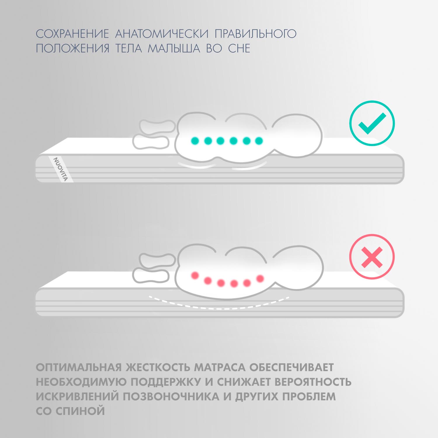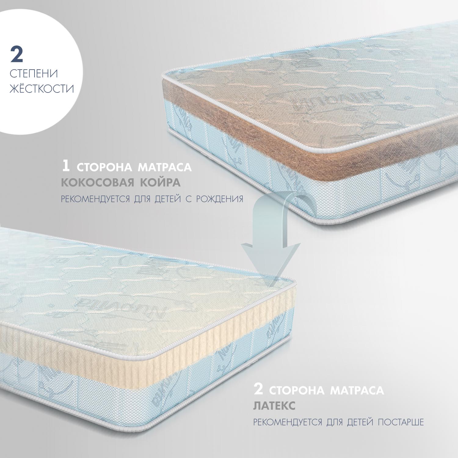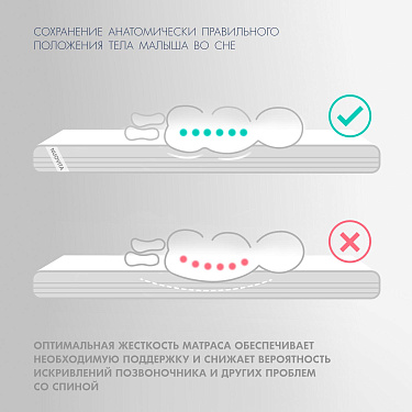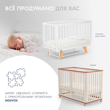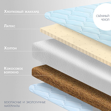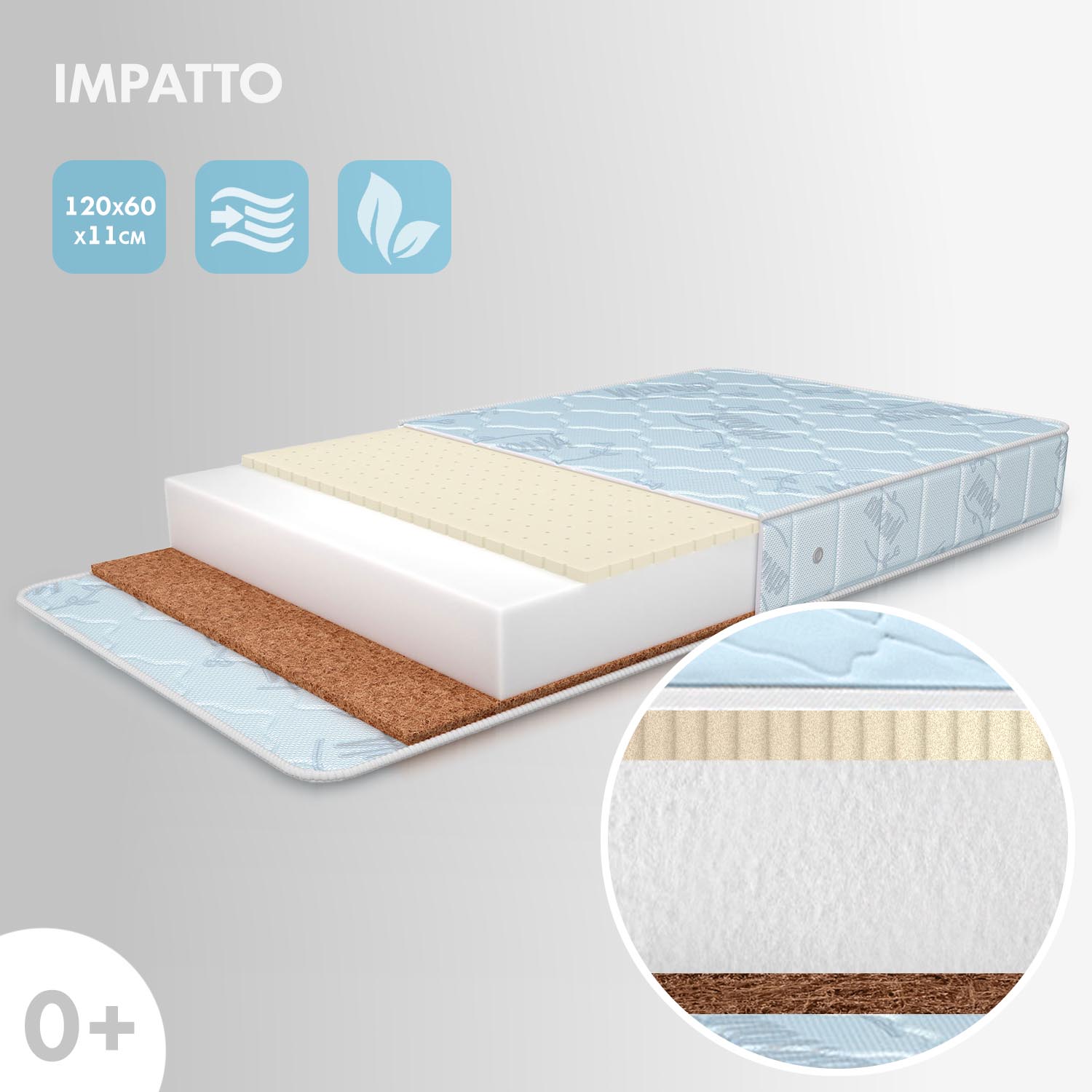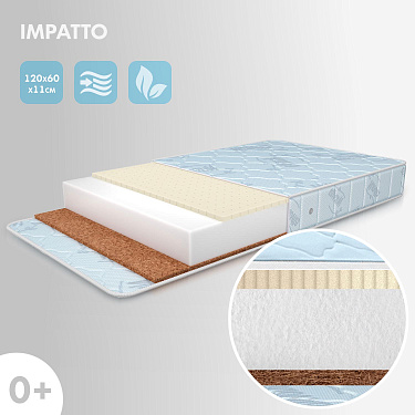 Детский матрас Nuovita Impatto. Максимальная нагрузка на матрас 30 кг. Состав наполнителя: холкон 8 см + кокос 1 см + латекс 1 см и аэраторы. Жесткость матраса выбирается по сезонности либо по комфортности, одна сторона матраса обладает жесткостью "выше среднего", другая - "средней". Чехол матраса съёмный, выполнен из хлопкового жаккарда.