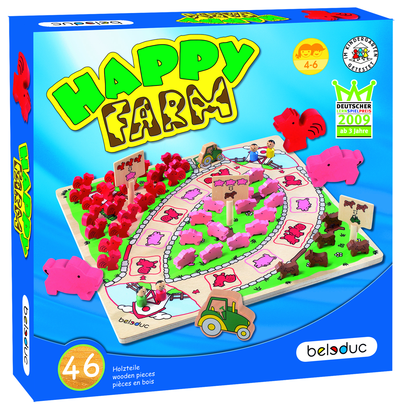 Развивающая игра Beleduc Веселая ферма рекомендована для детей в возрасте от 3-х лет и старше. На своем пути через игровое поле игрок собирает животных. По достижению одного из двух амбаров он сможет обменять животных. Кому первому удается получить двух коров, приобретает трактор. Победителем и обладателем фермерского приза в виде трактора станет тот игрок, которому быстрее всех удастся обменять собранных животных. В процессе игры ребенок обучается счету, у него развивается и тренируется память, сообразительность, стратегическое мышление. Включает 50 деталей из дерева: 1 игровое поле, 4 игровых фигурки, 20 петухов, 15 свиней, 5 коров, 1 фигурка трактора, 3 знака ,1 кубик. Размер; 65 x 385 x 385 мм.