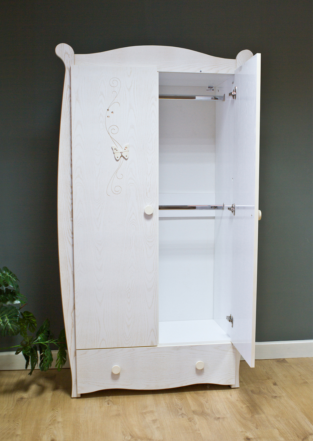 Внутри деление вертикальной перегородкой на два отдела. Один отдел оснащён тремя полками, второй отдел - двумя штангами для плечиков. В нижней части установлен большой вместительный выдвижной ящик на шариковых направляющих для хранения постельных принадлежностей, игрушек.