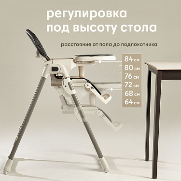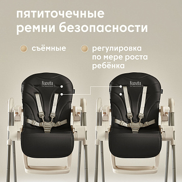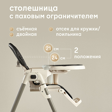Очевидный плюс данной модели — способность «расти» вместе с маленьким владельцем. Стульчик для кормления ребенка NATIVO имеет шесть уровней регулирования по высоте, три положения подножки, столешницу можно установить в двух положениях — ближе и дальше от малыша, а дополнительные прорези в спинке позволяют переставить ремни безопасности выше по мере роста ребенка.