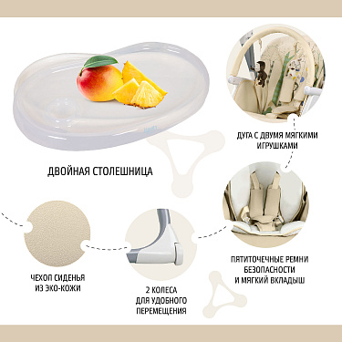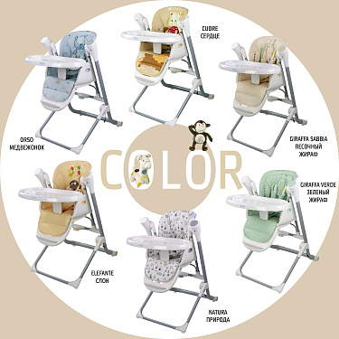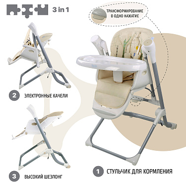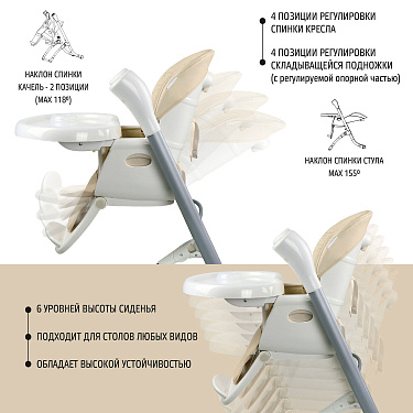 Качели трансформируются в стульчик, использовать который можно до достижения малышом трёх лет. Подножку стульчика и высоту его сидения можно регулировать, подстраиваясь под рост малыша, есть 4 уровня подн