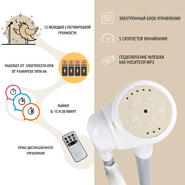 Таймер, рассчитанный на 8, 15 и 30 минут, поможет родителям отвлечься для выполнения насущных дел, в то время, когда их малыш беззаботно раскачивается и наблюдает за подвешенными на дуге игрушками. Можно выбрать любую из 5 скоростей укачивания, включить одну из 12 запрограммированных мелодий, или подключить внешний накопитель и поставить любимую музыку.