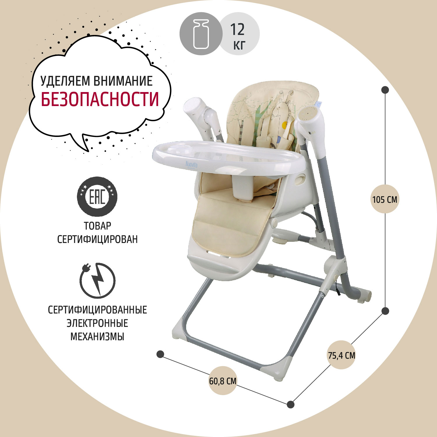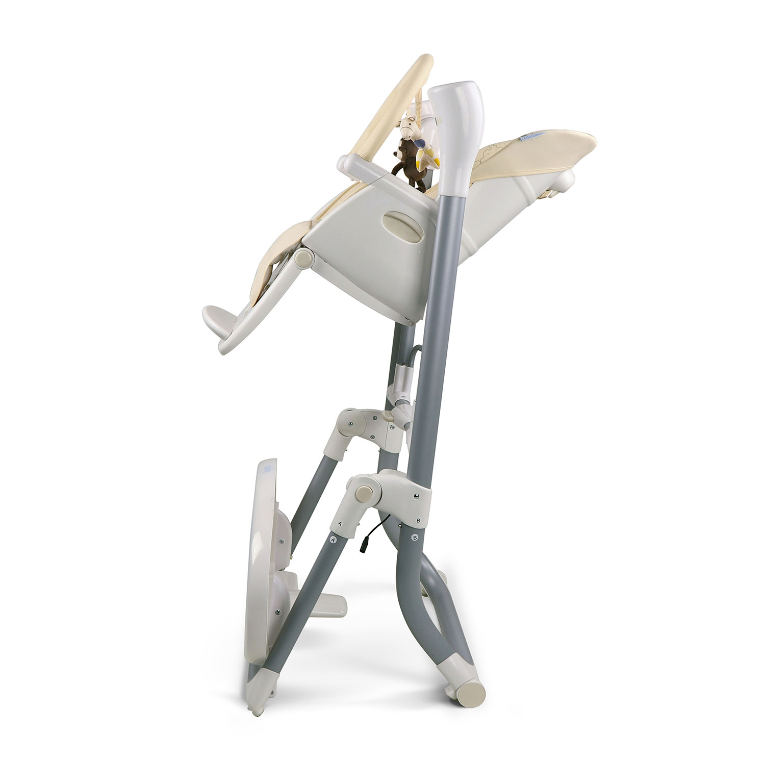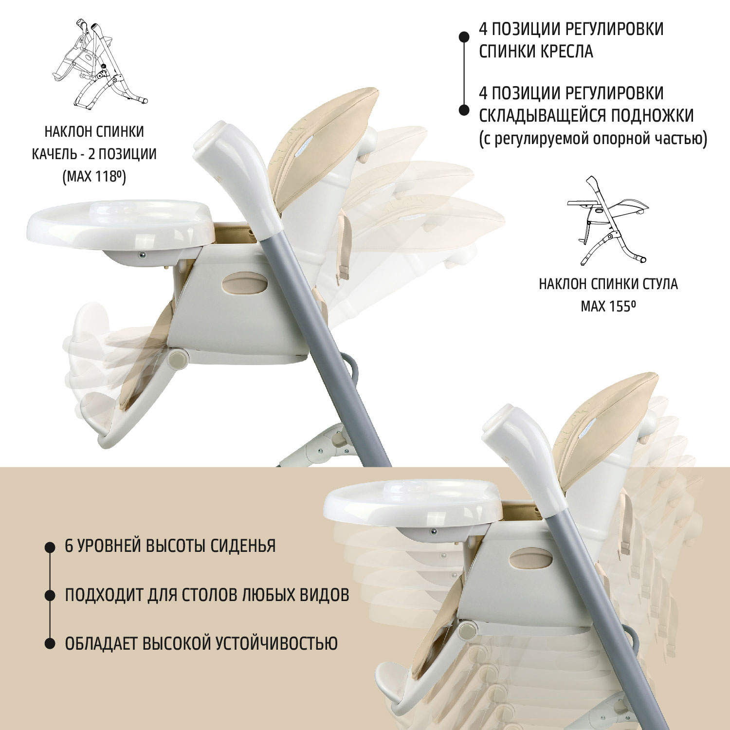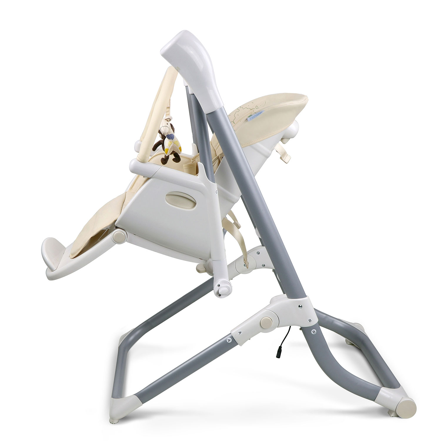 Качели трансформируются в стульчик, использовать который можно до достижения малышом трёх лет. Подножку стульчика и высоту его сидения можно регулировать, подстраиваясь под рост малыша, есть 4 уровня подн