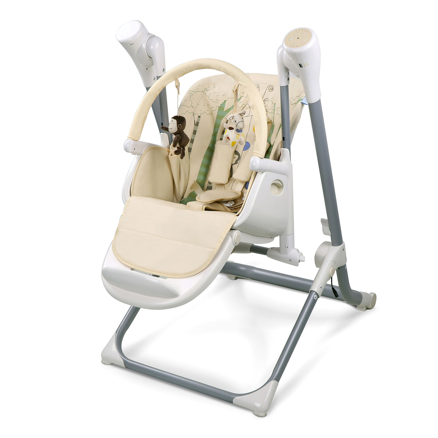 Электрокачели снабжены бесшумным маятниковым механизмом, который позволяет плавно и равномерно укачивать малыша, развлекая его и успокаивая. Они имеют две позиции регулировки спинки кресла, для того, чтобы как можно удобнее расположить ребёнка и надёжные 5- точечные ремни для безопасной фиксации малыша.