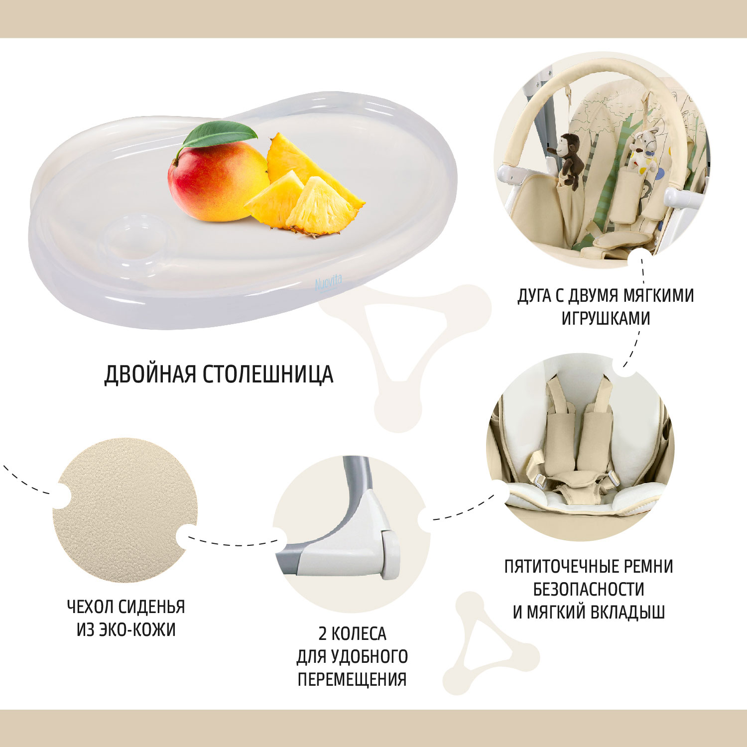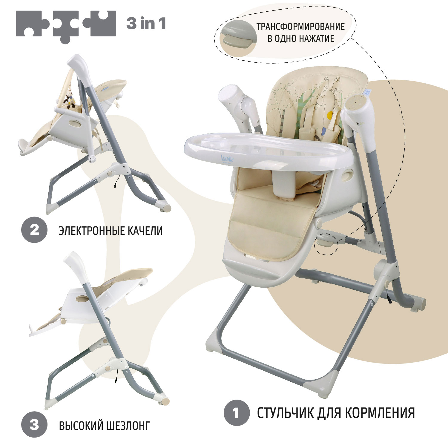 Прочный и устойчивый стульчик - трансформер Nuovita Unico Leggero будет служить качелями и полноценным стульчиком для кормления.