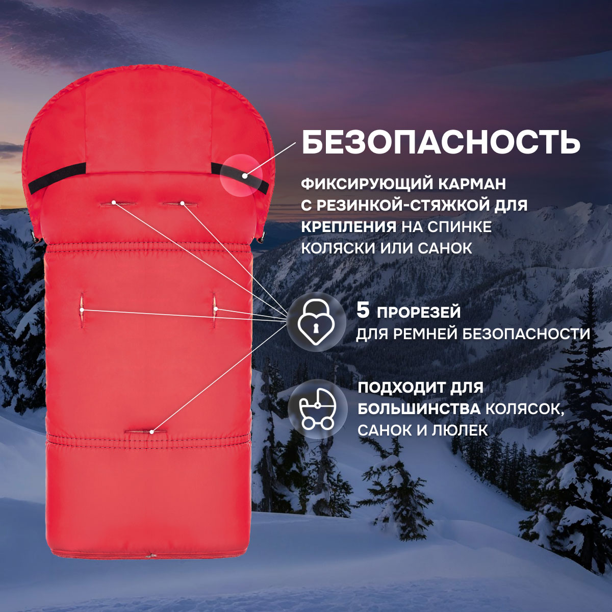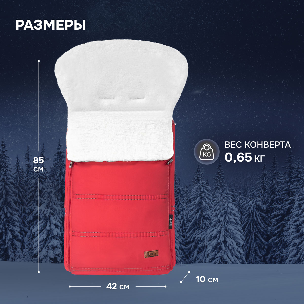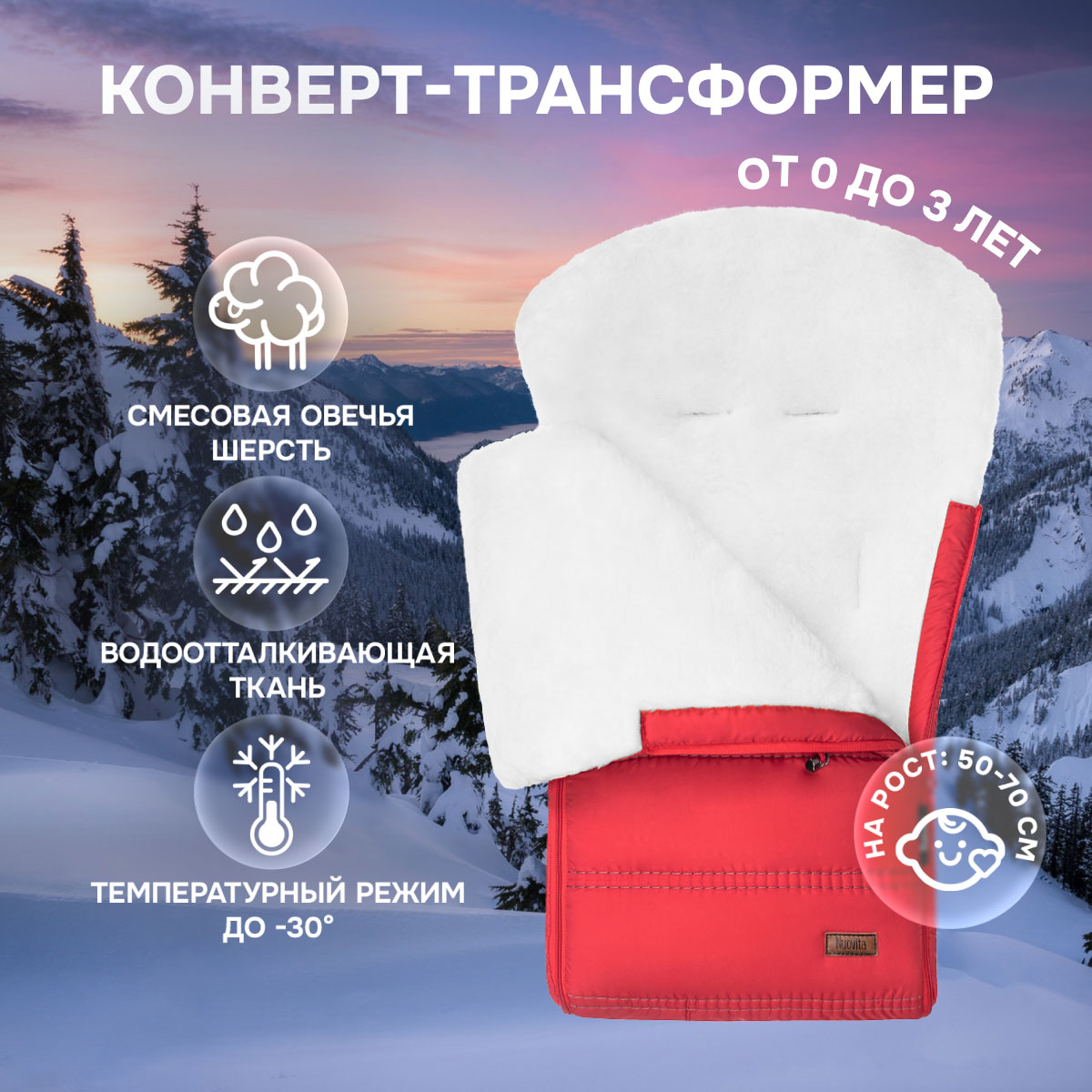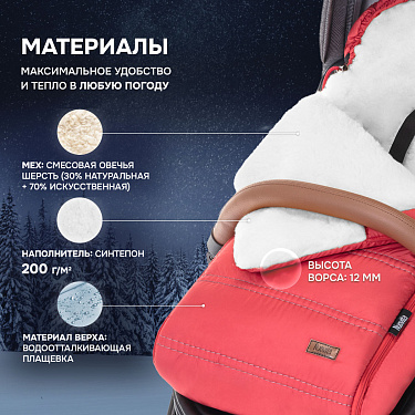 Основа конверта — смесовая овечья шерсть, которая имеет густой и теплый ворс высотой 12 мм. Благодаря природным качествам шерсти внутри конверта обеспечивается оптимальная терморегуляция. Слой синтепона создает дополнительную мягкую прослойку, не утяжеляя изделие (вес конверта всего 0,65кг).