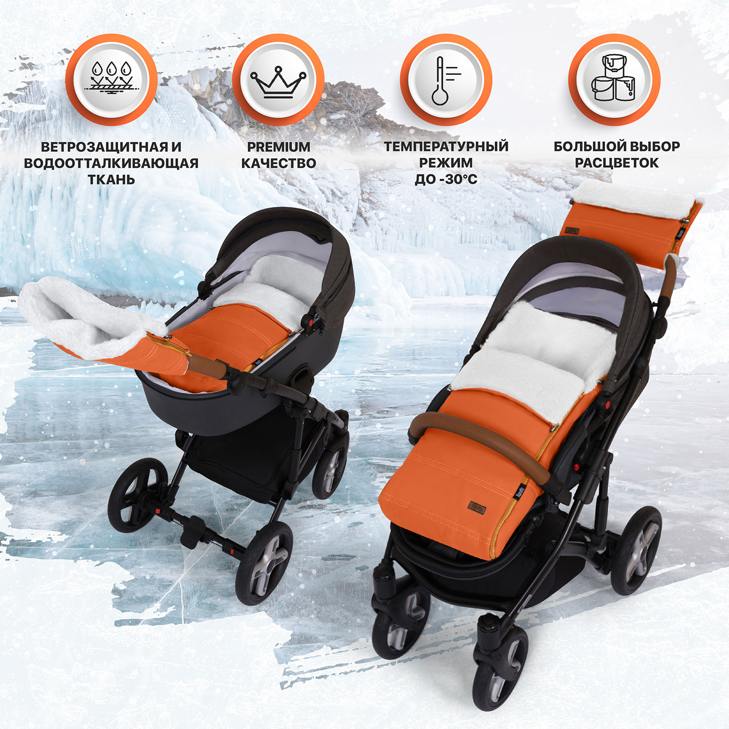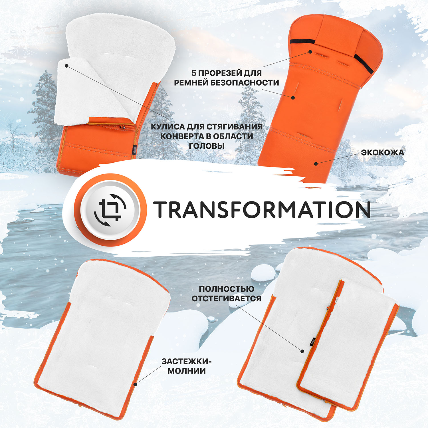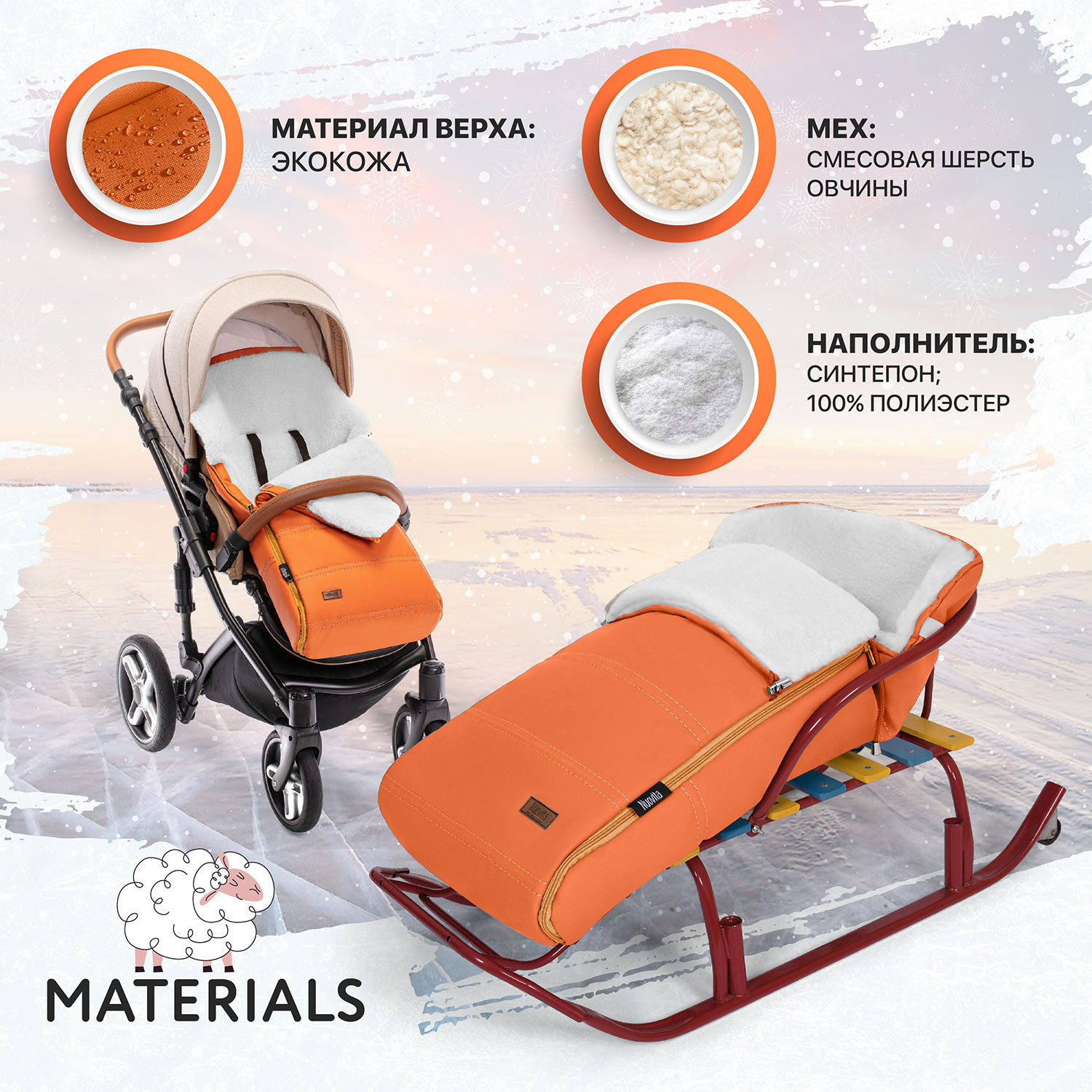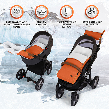 Внешний слой конверта — экокожа с водоотталкивающей пропиткой. Материал отлично зарекомендовал себя в морозы, дождь, снег и устойчив к перепадам температуры. Утеплитель — синтепон, придающий конверту исключительную мягкость.