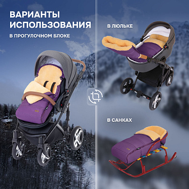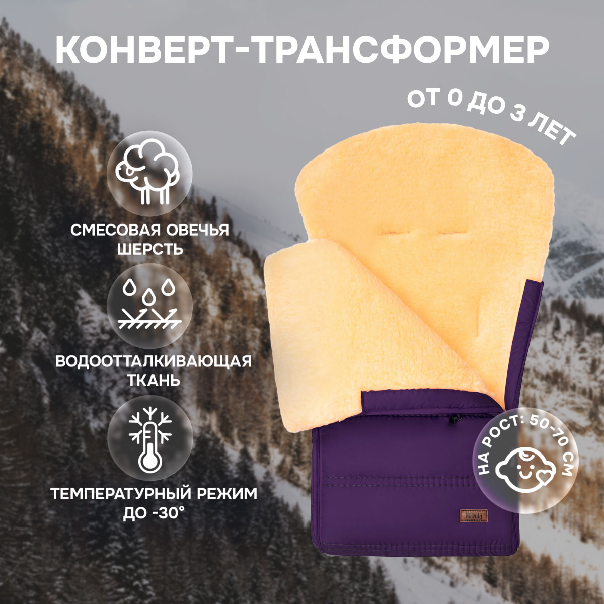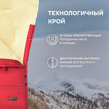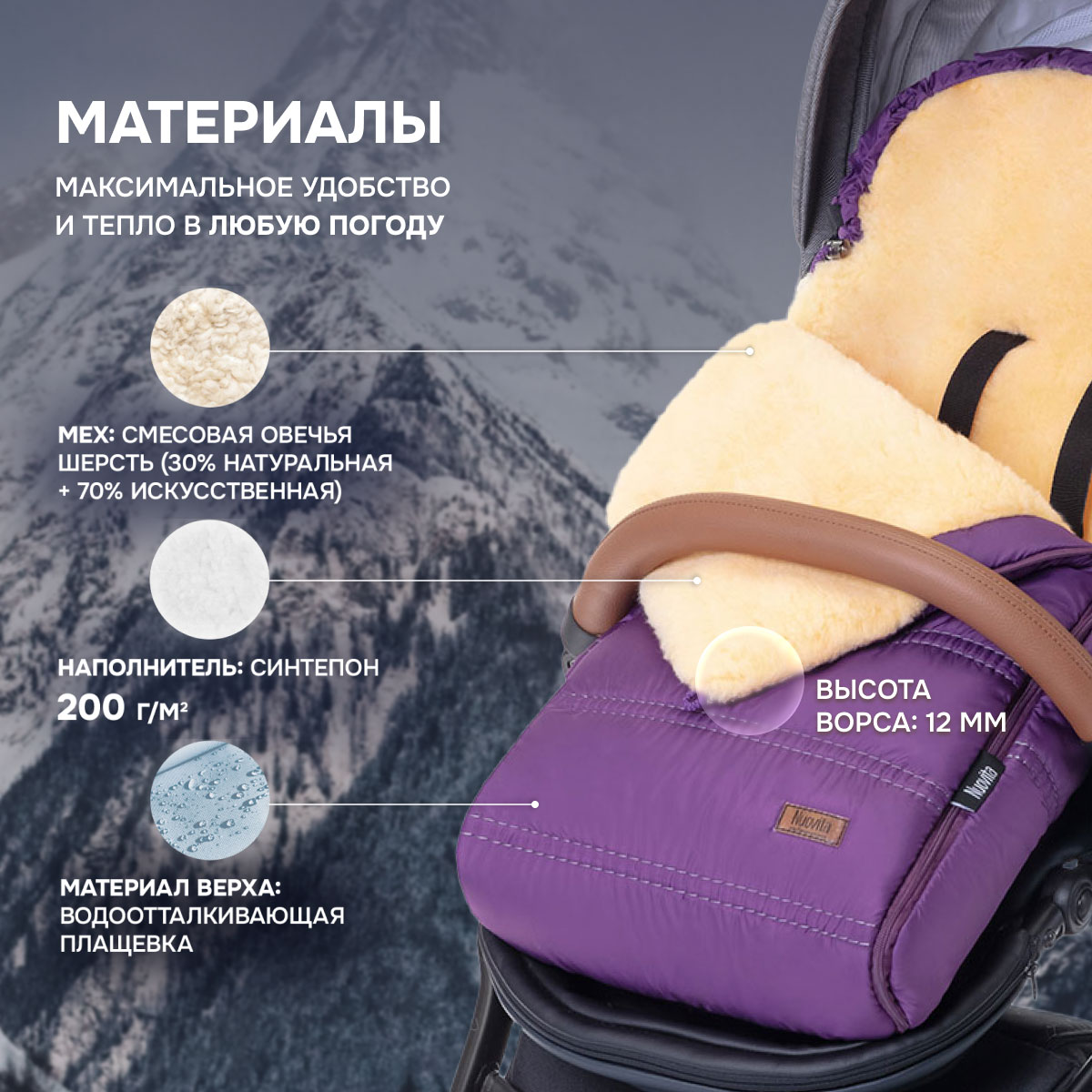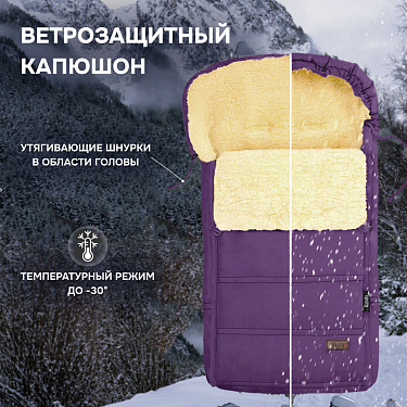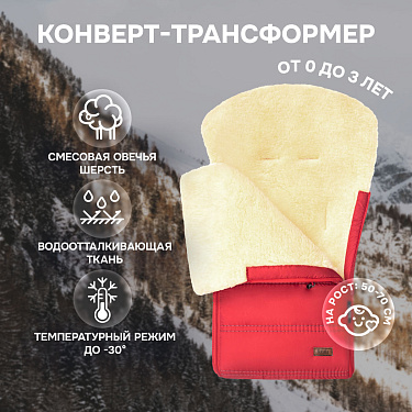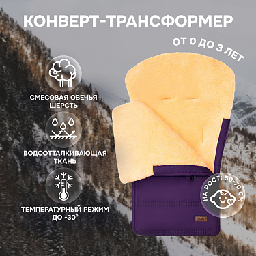 Основа конверта — смесовая овечья шерсть, которая имеет густой и теплый ворс высотой 12 мм. Благодаря природным качествам шерсти внутри конверта обеспечивается оптимальная терморегуляция. Слой синтепона создает дополнительную мягкую прослойку, не утяжеляя изделие (вес конверта всего 0,65кг).
