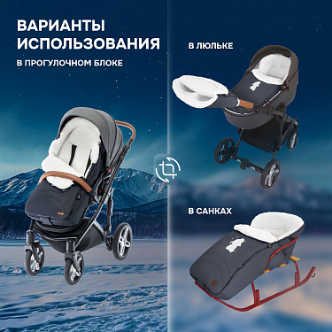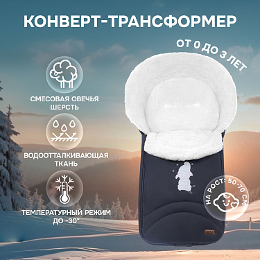 Внутренняя часть конверта изготовлена из смесовой шерсти, которая представляет собой сочетание натуральной овечьей шерсти и текстильного материала. Пушистый ворс имеет высоту 12 мм, он хорошо согревает в мороз (изделие рассчитано на использование до температуры -30 градусов) и обеспечивает малышу комфорт во время прогулки.