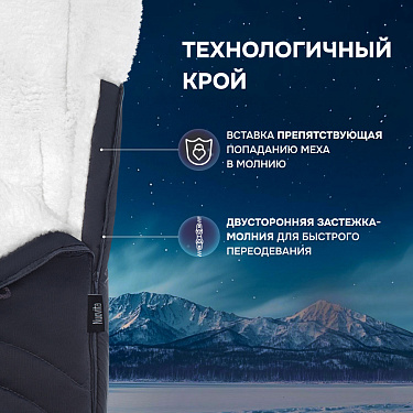 Материал чехла — ткань PU с нанесенной на изнаночную сторону специальной мембранной пленкой. Материал не пропускает внутрь воду, поскольку обладает односторонней паро- и воздухопроницаемостью и хорошо сохраняет тепло внутри конверта. В качестве прослойки между покрытием и шерстяной частью используется синтепон.