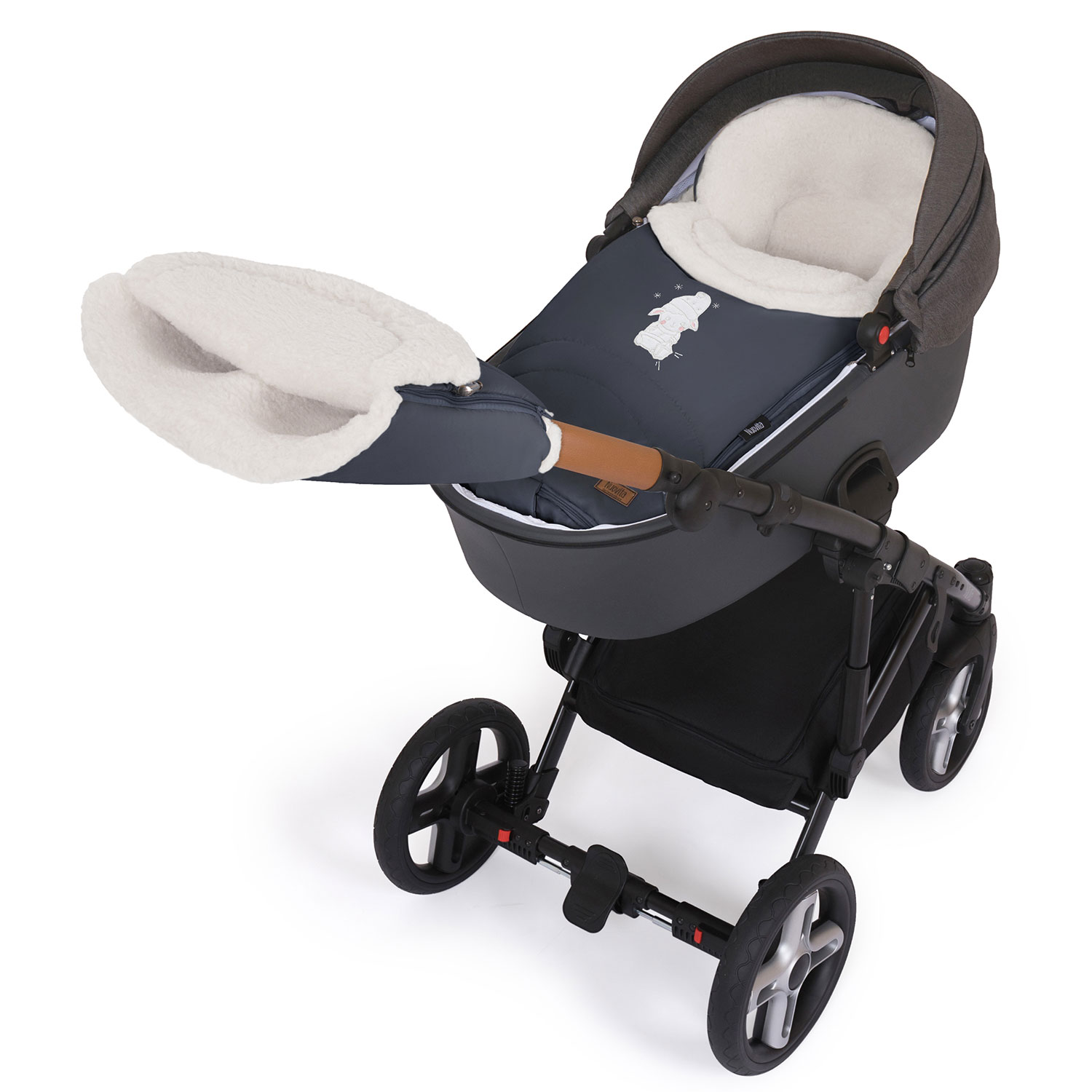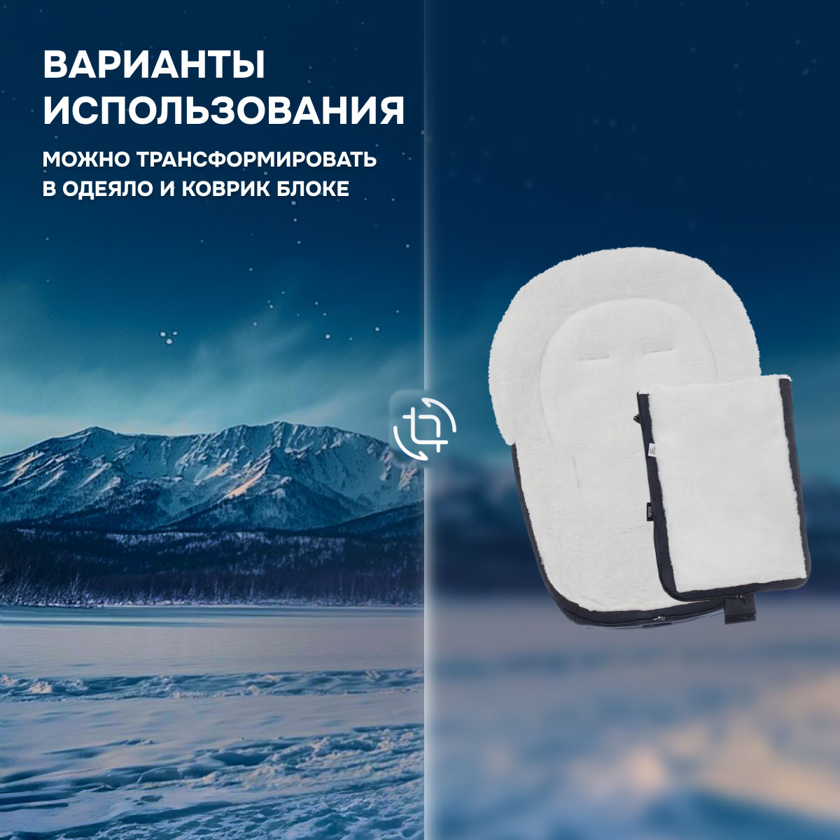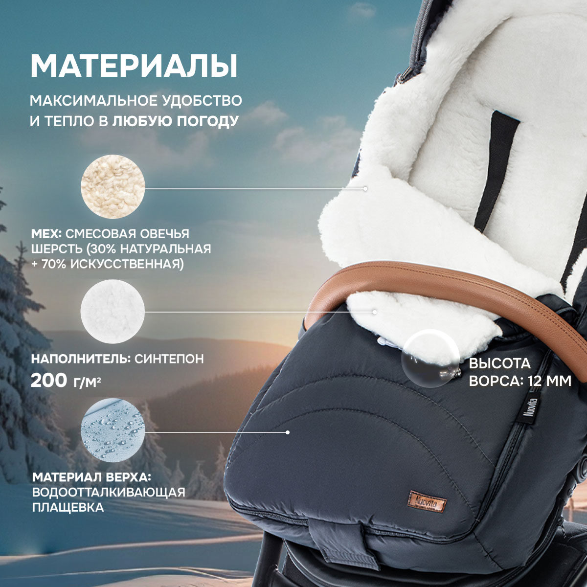 Внутренняя часть конверта изготовлена из смесовой шерсти, которая представляет собой сочетание натуральной овечьей шерсти и текстильного материала. Пушистый ворс имеет высоту 12 мм, он хорошо согревает в мороз (изделие рассчитано на использование до температуры -30 градусов) и обеспечивает малышу комфорт во время прогулки.