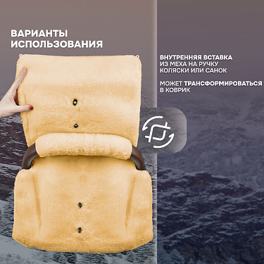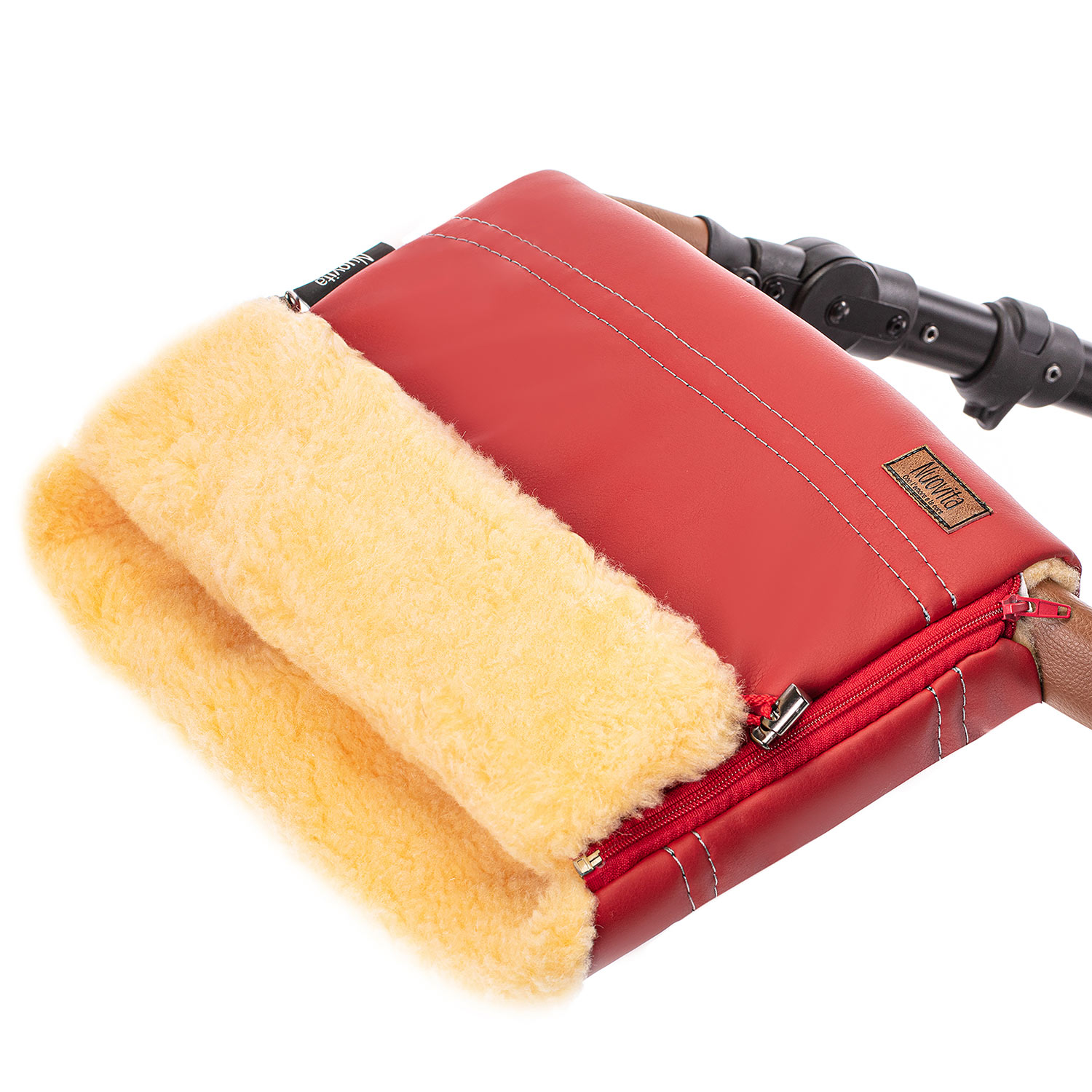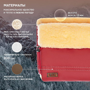 Внутренняя часть муфты сделана из смесовой овечьей шести, имеет текстильную основу и мягкий объемный ворс высотой 12 мм. Использование текстиля в качестве основы для мехового полотна уменьшает вес изделия, а уникальные свойства шерсти позволяют сохранять тепло даже в сильные морозы, надежно защищая руки от переохлаждения.
