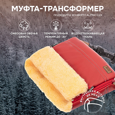 На выбор предлагаются 2 цвета меха — белый и персиковый, и 10 расцветок наружного покрытия, среди которых родители могут выбрать муфту в цвет коляски или детского конверта. Рекомендуется использование муфты NUOVITA ALPINO LUX с меховым конвертом из одноименной коллекции.